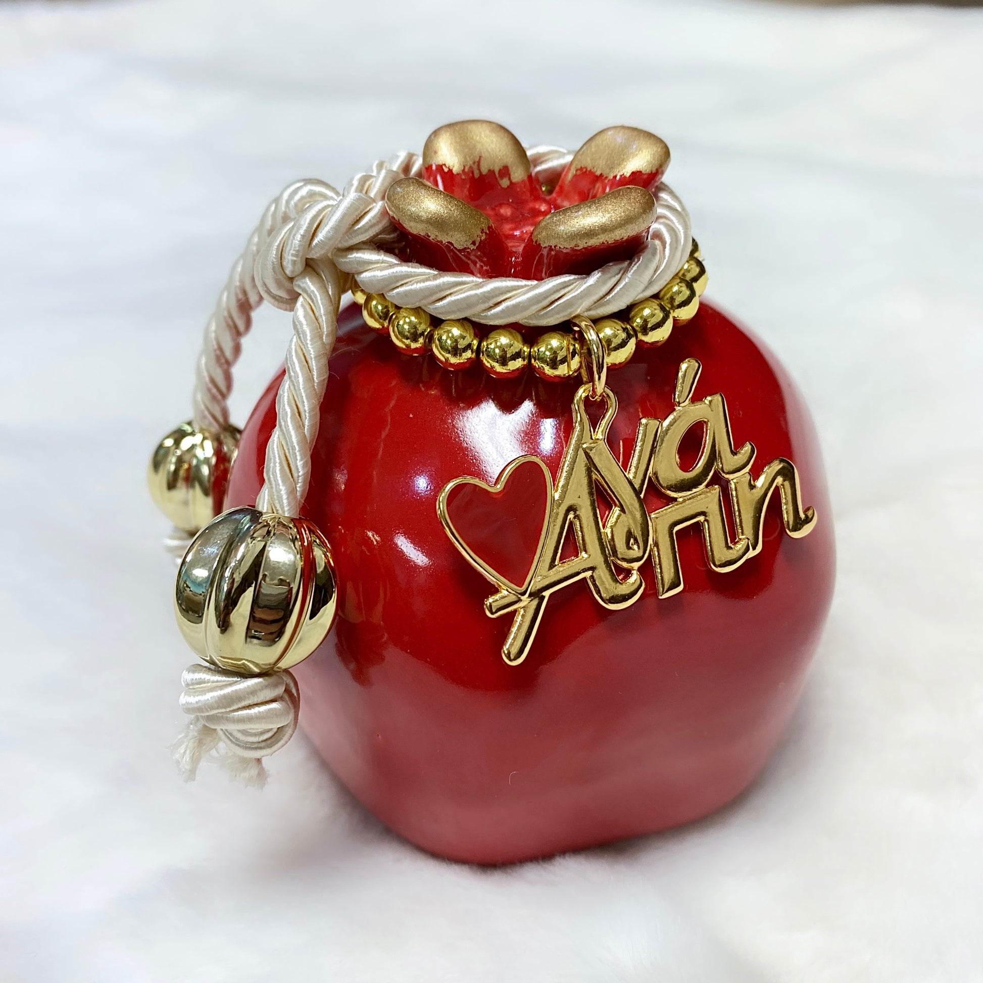 Ceramic red coloured pomegranate with off white & gold beads trim. Embellished with agapi charm