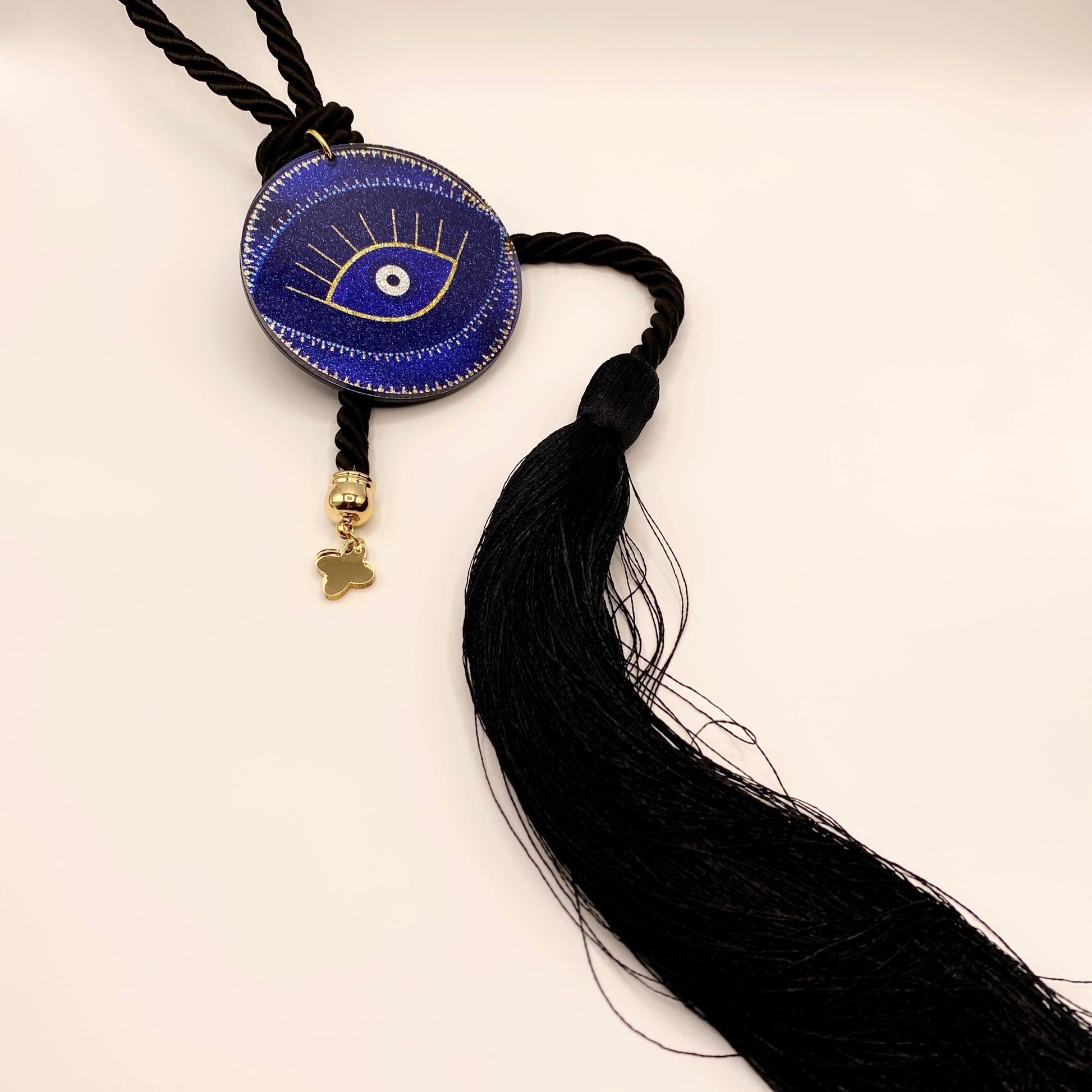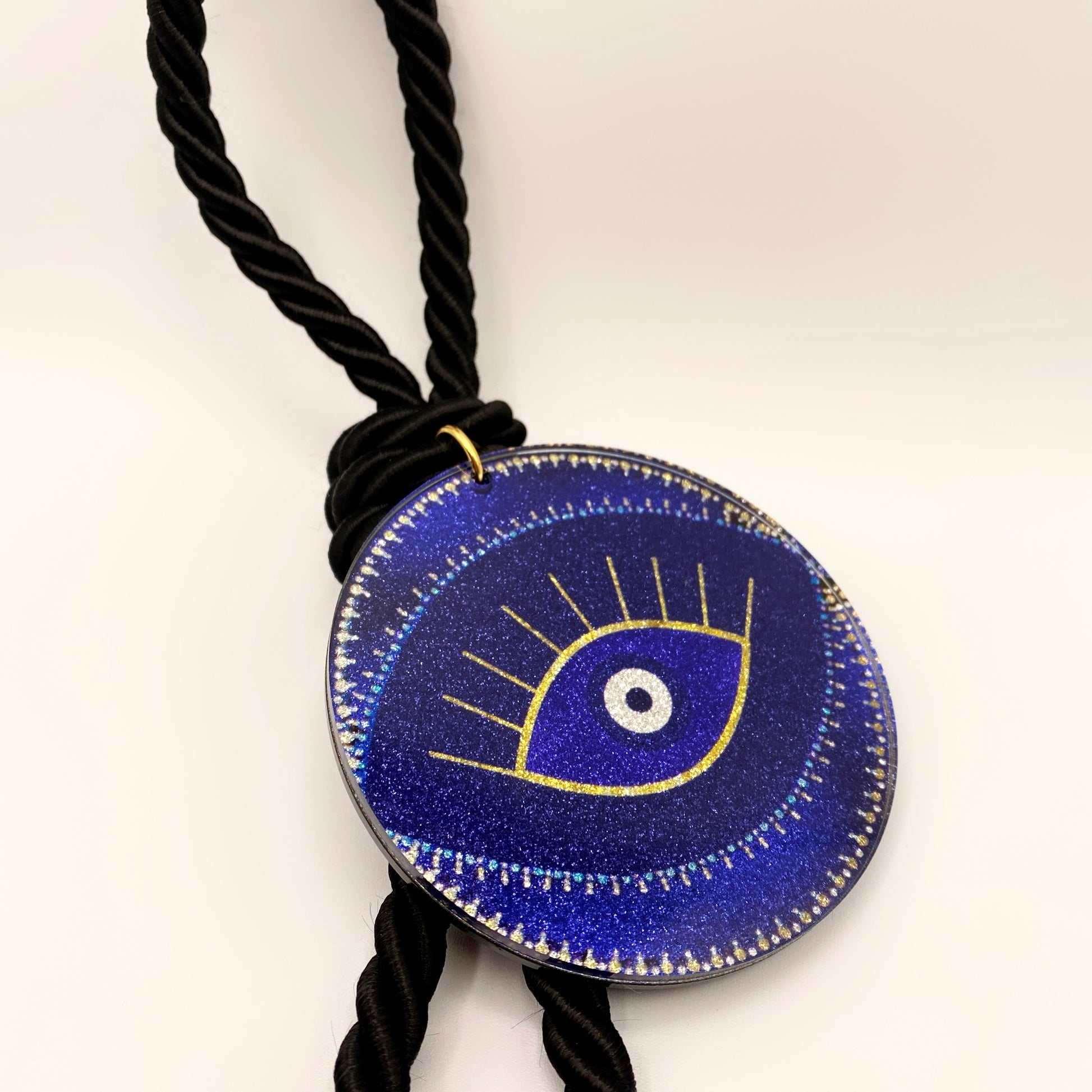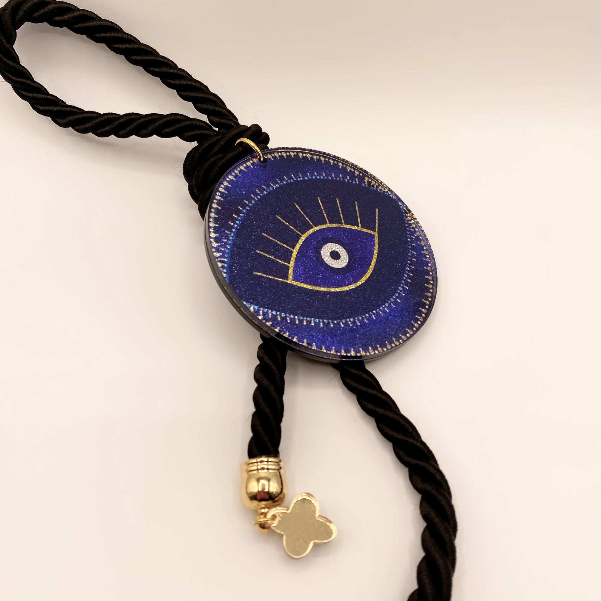 A black rope with black tassel, round plexiglass eye charm with lashes & glitter detailing and on opposite rope a cross charm.