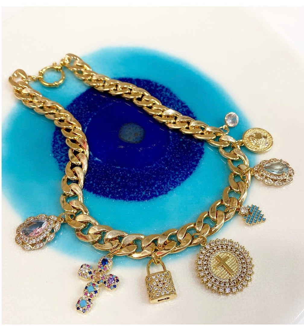 Pink teardrop glass crystal- Multicoloured glass crystal cross-Cz lock-Cz cross pendant- Cz heart-Blue teardrop glass crystal-Brass coin-Cz mini charm