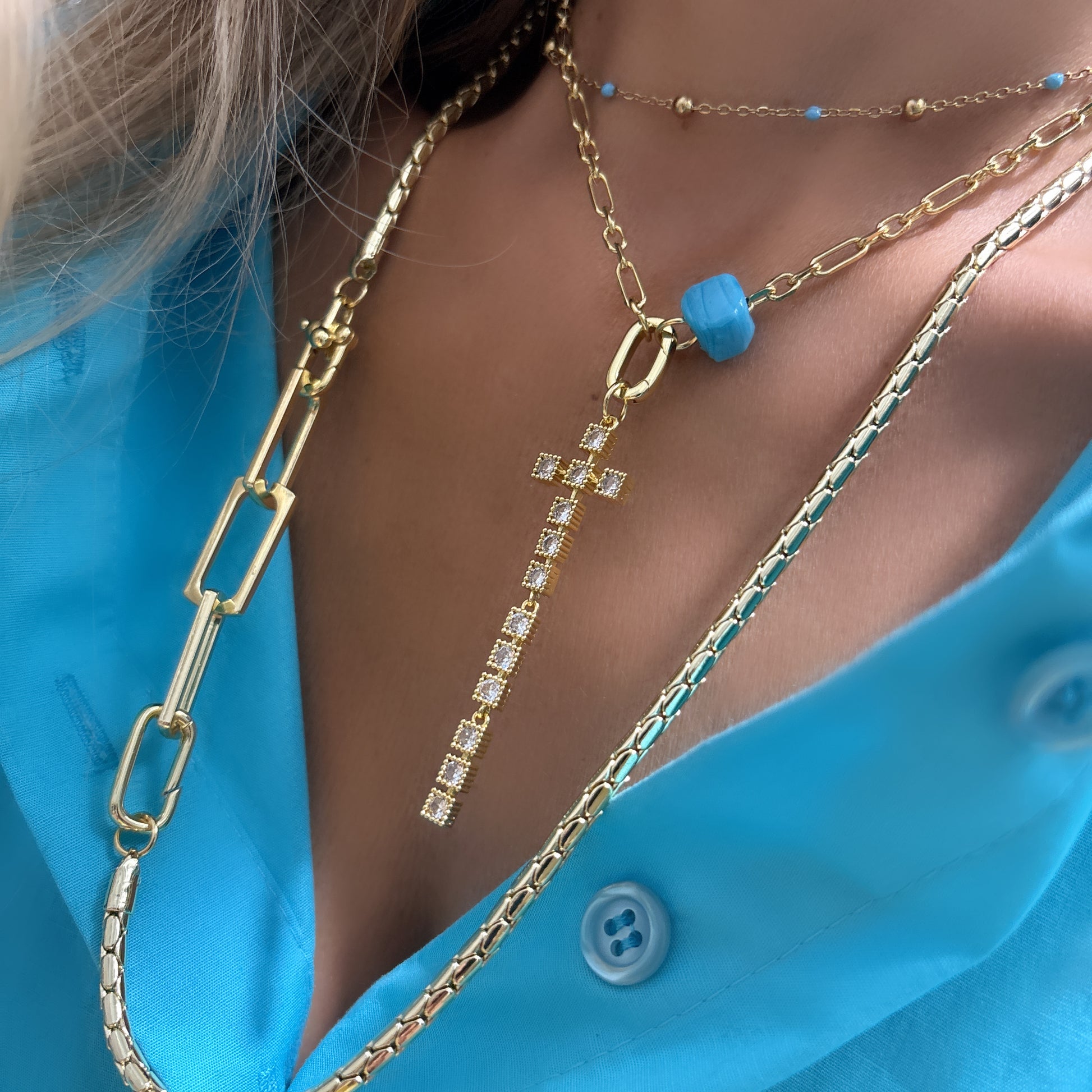 Elevate your style with our CHRYSTALIA LAYERED NECKLACES. Featuring a sleek cross necklace with blue cube bead, delicate enamel choker chain, and chunky chain, these necklaces bring a unique and elegant touch to any outfit. Create a trendy layered look or wear separately for a timeless addition to your jewelry collection.