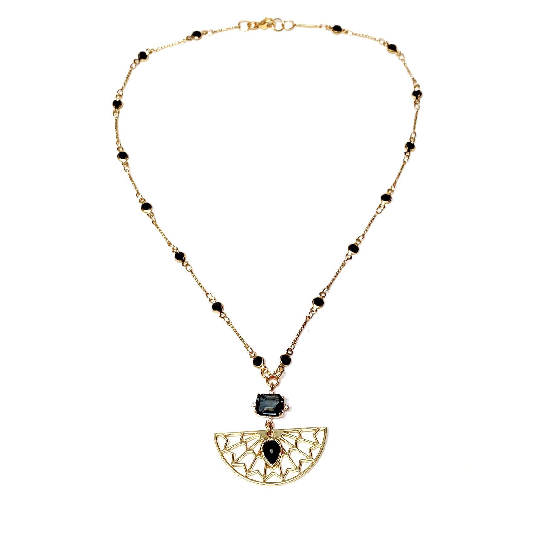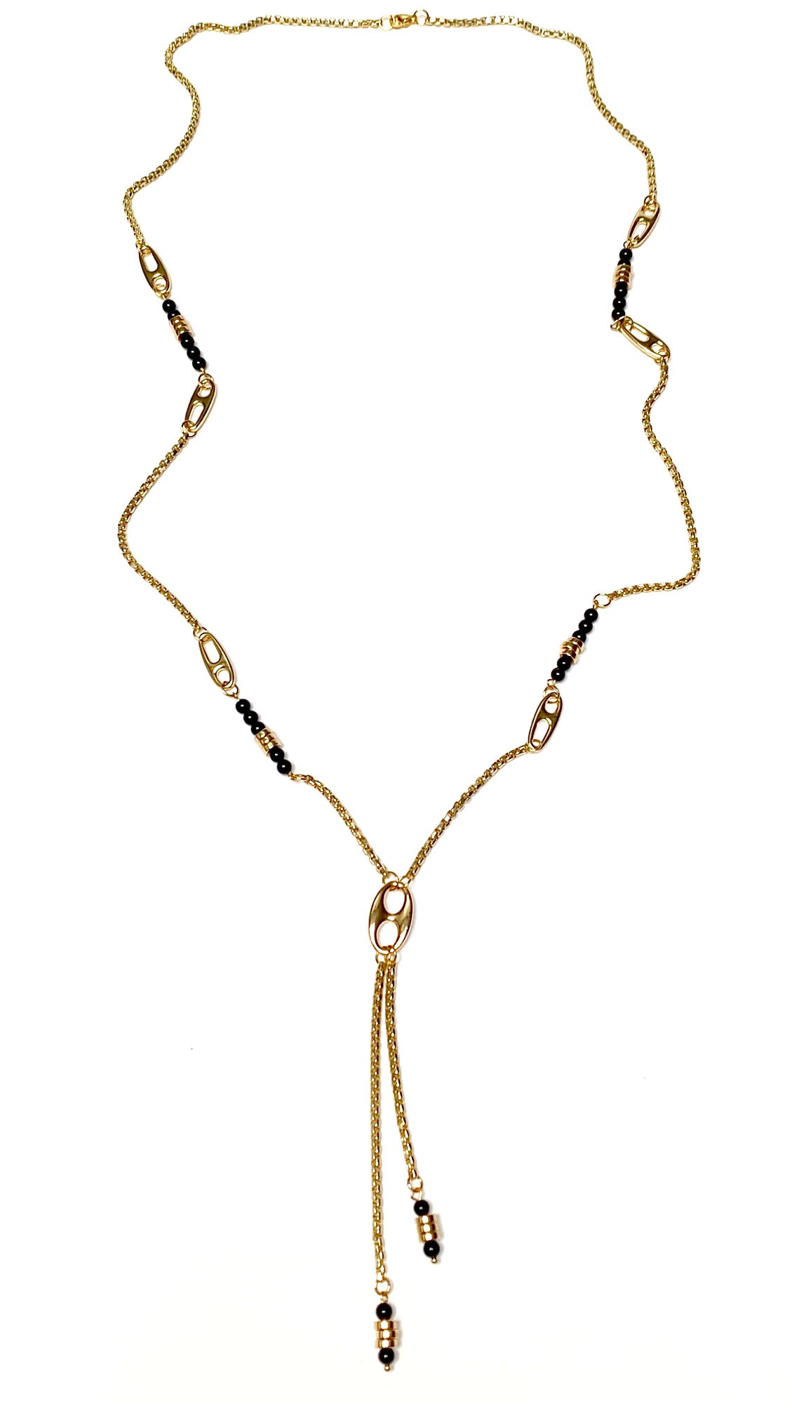 #2 Brass gold plated chain embellished with onyx beads, gold plated hematite beads & links lobster clasp closure measuring 18 inches with additional 5 inch chain drop