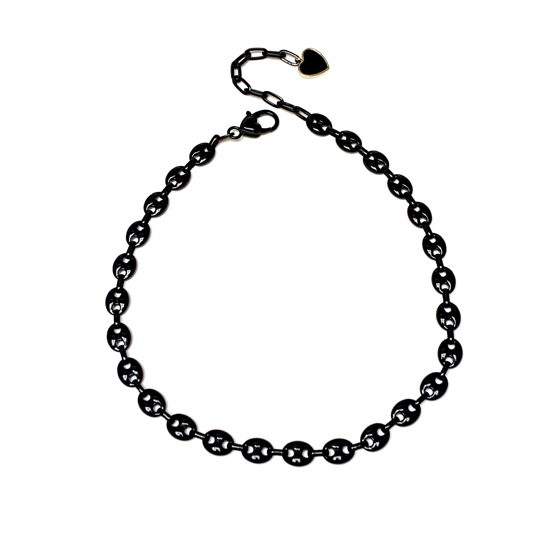 #1 Brass chain spray painted black with dangling enamel heart & lobster clasp closure measuring 20 inches