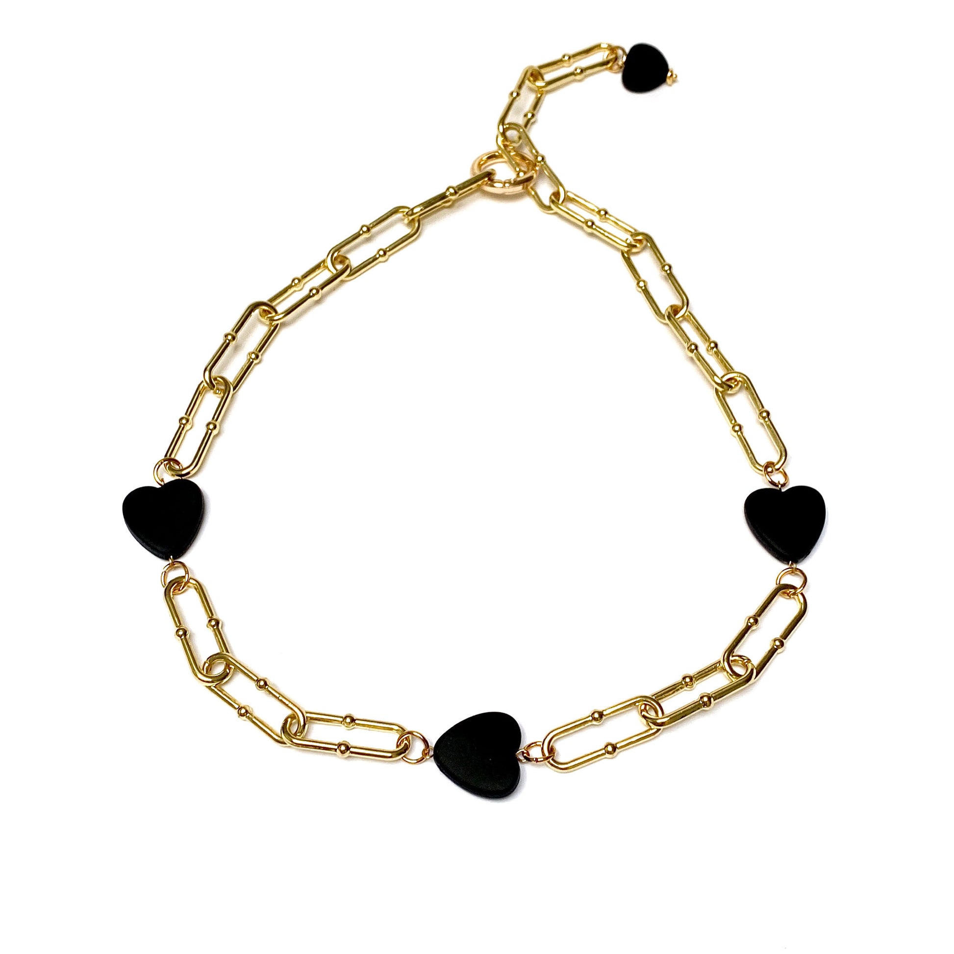 #1 Onyx 3mm strand with hematite gold plated hearts & lobster clasp closure measuring 14 inches with extension