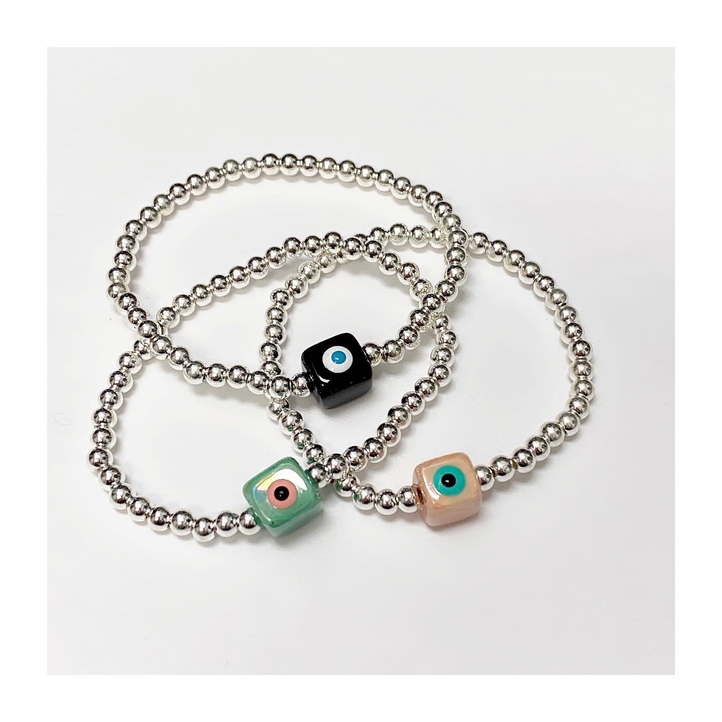 Stretch bracelets with ceramic cube eye in green, peach and black, layer it with smaller hematite bead bracelets. Silver plated hematite beads, 4mm. Standard size 7inch.