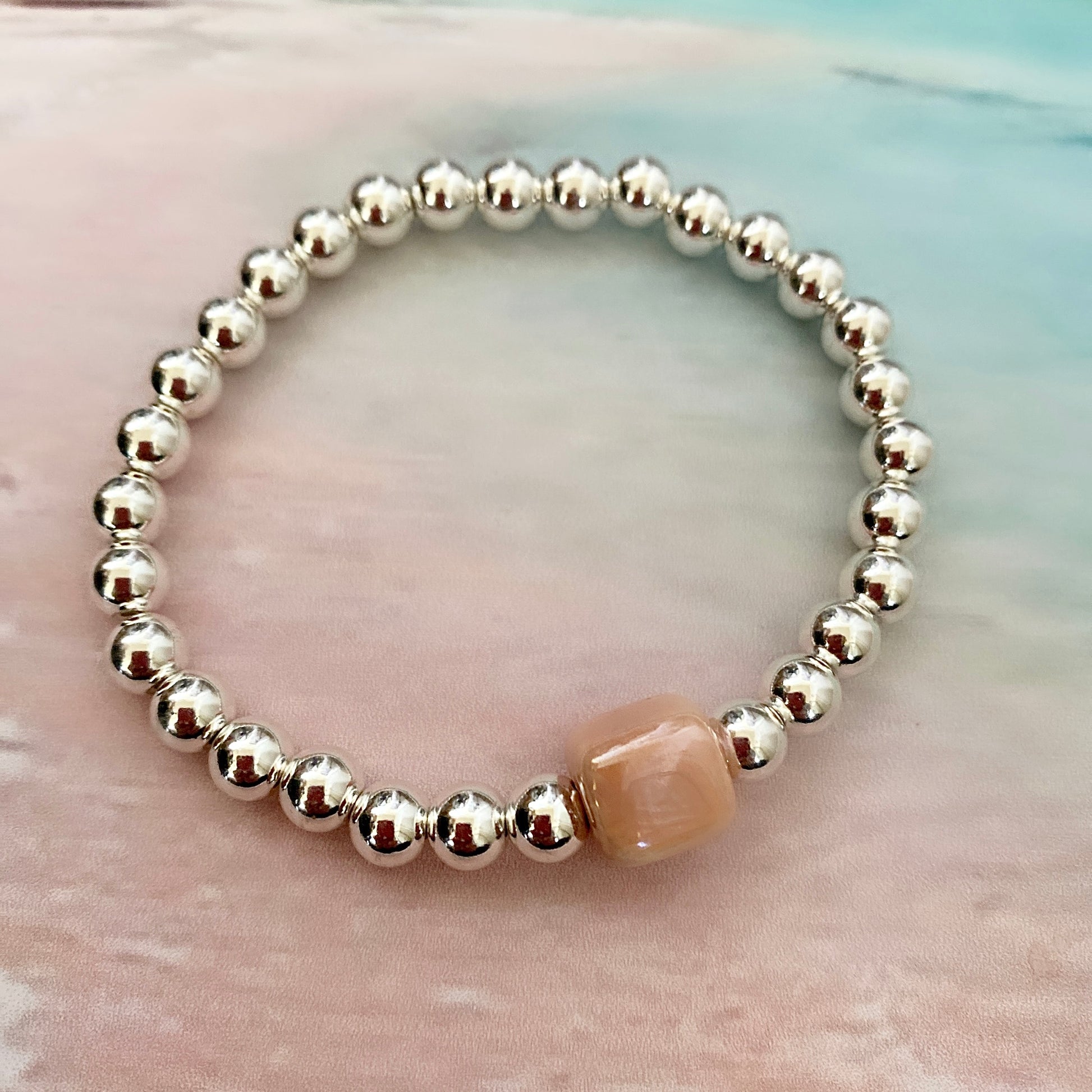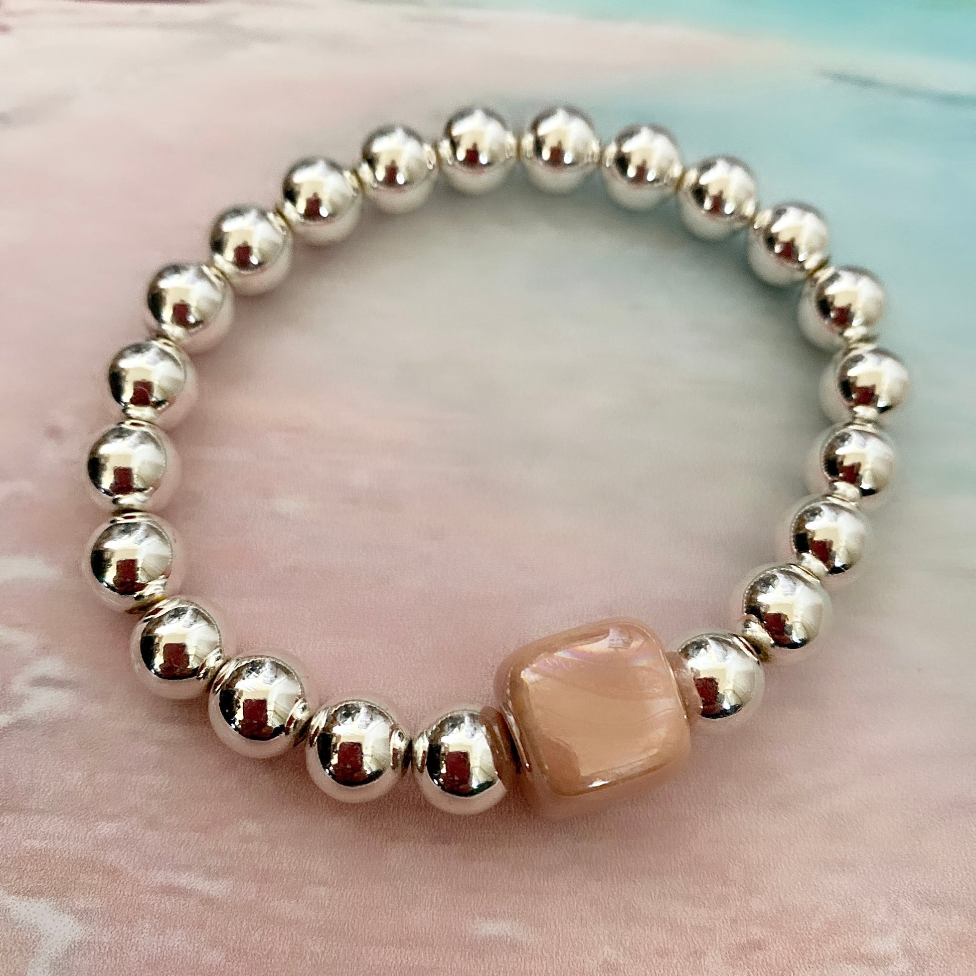 #2- Hematite silver plated 6mm beads with ceramic cube 10 mm (stretch)