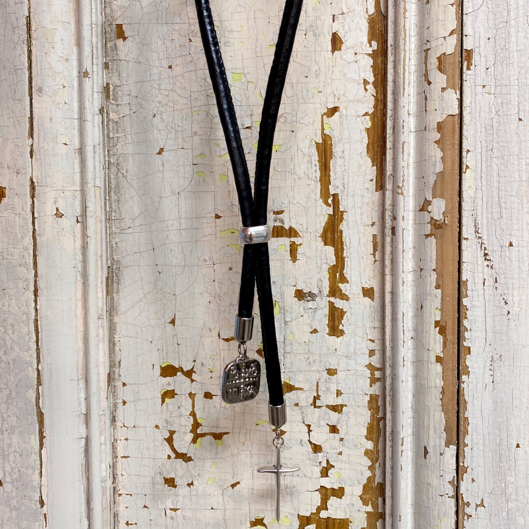 Icxc nika charm and silver plated cross on black vegan leather joined with a silver bead for adjusting.