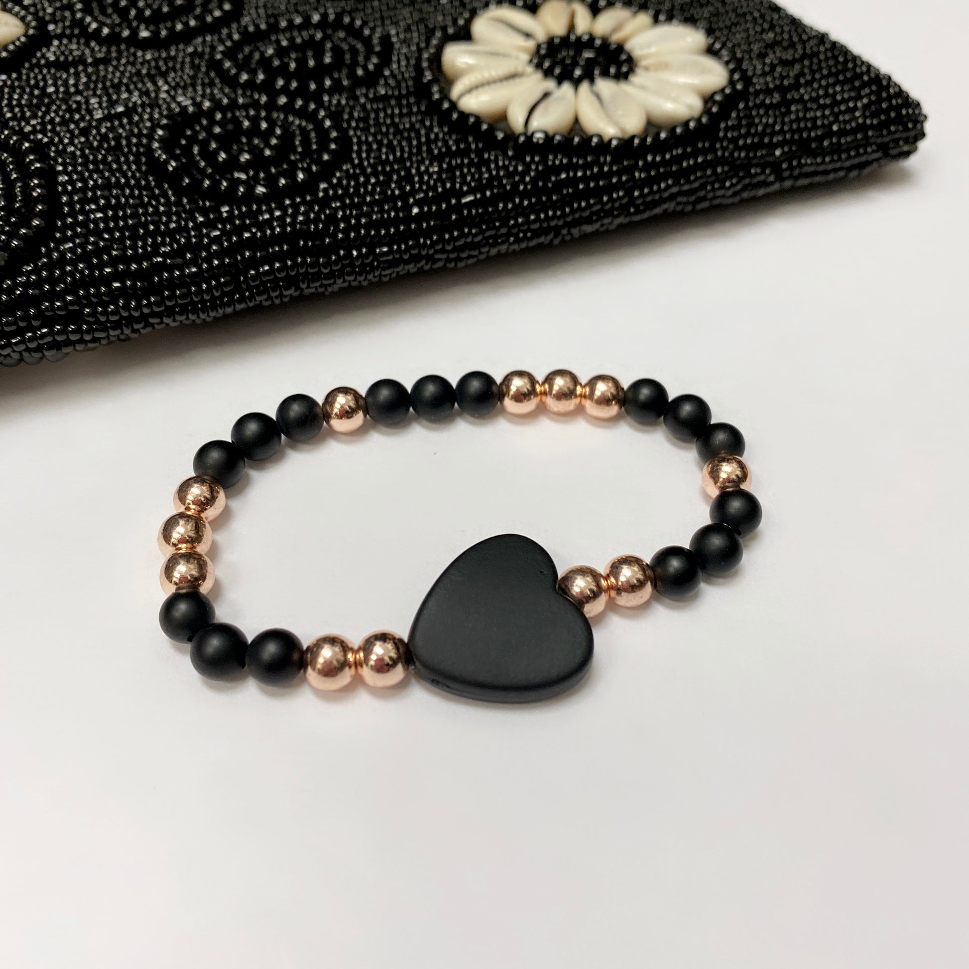 #2 Onyx 4mm beads with acrylic matte black heart & rose gold plated accents (stretch),
