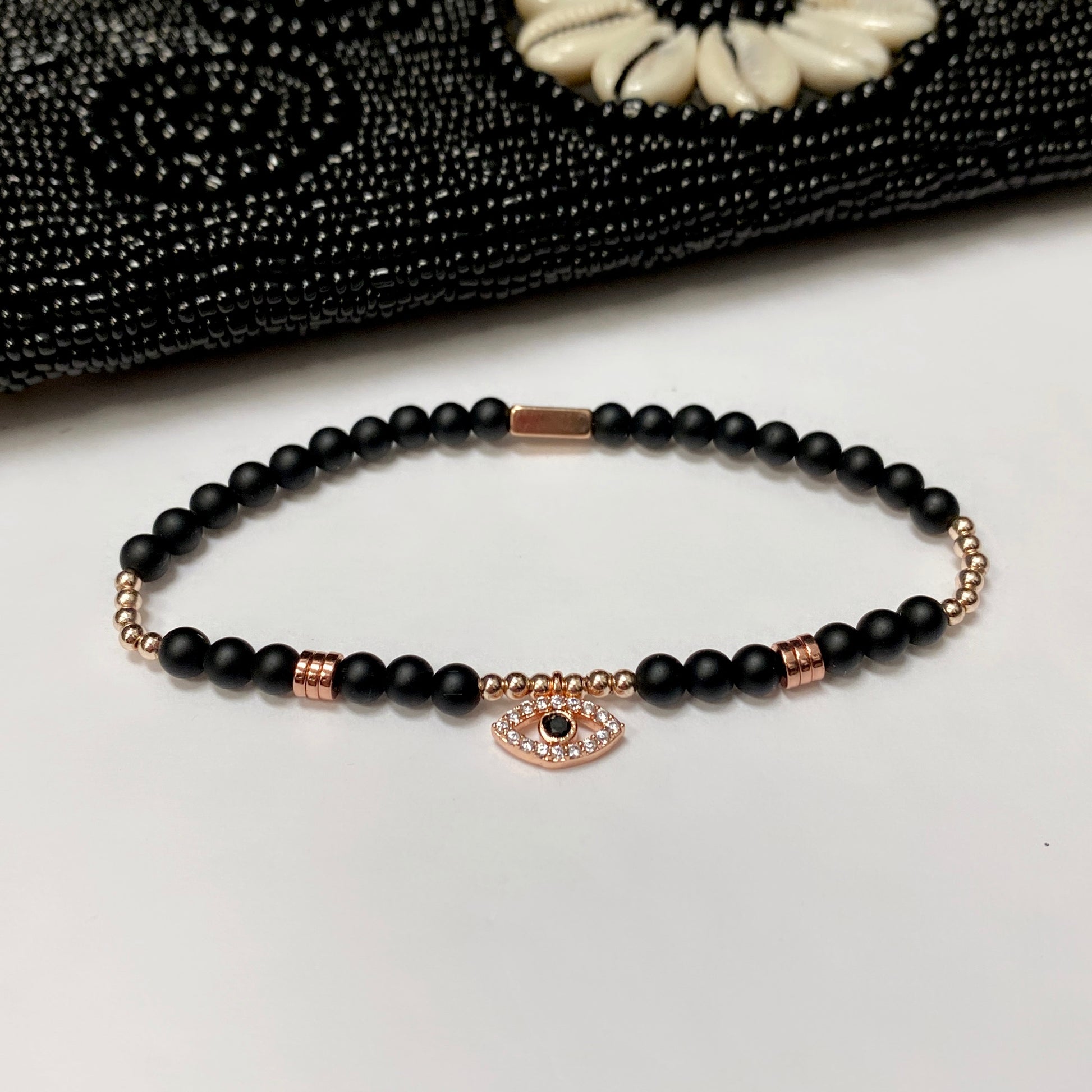 #7 Onyx 4mm beads with hematite rose gold plated 2mm beads & cz eye (stretch),