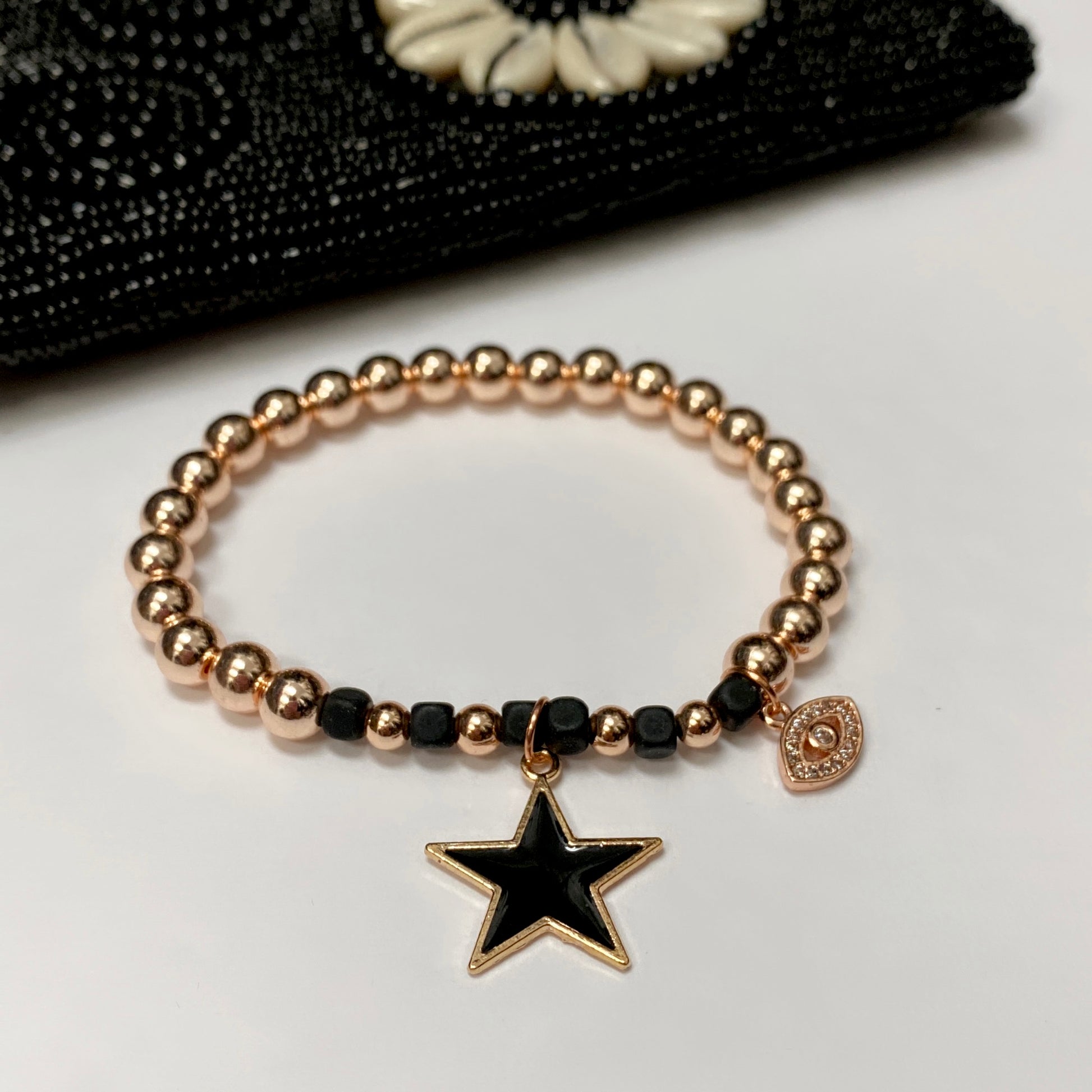 #1 Hematite rose gold plated 6mm with rubberized hematite 4mm black bead & cz eye charm and rose gold plated enamel star (stretch),