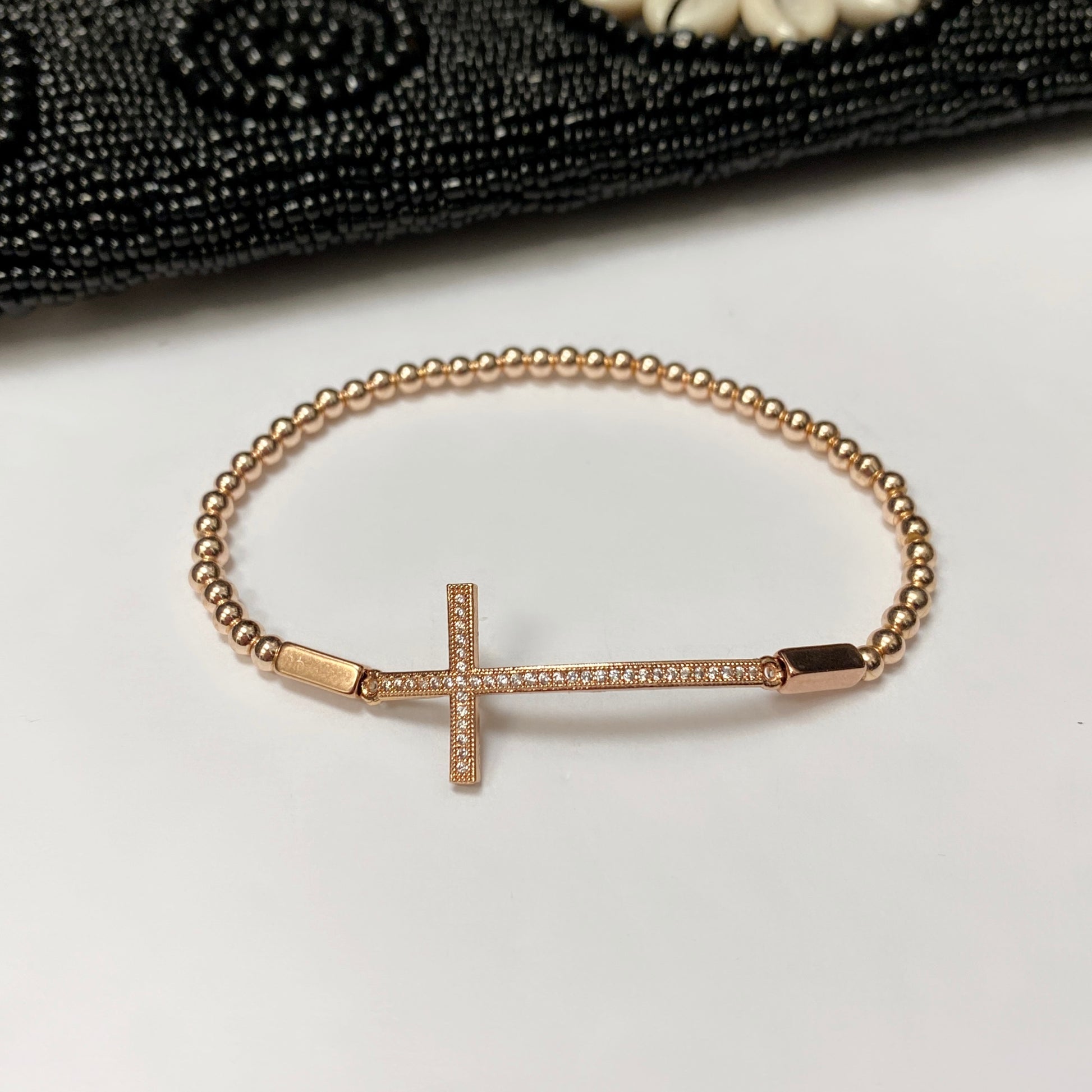 #4 Hematite rose gold plated 4mm with cz rose gold plated cross (stretch),