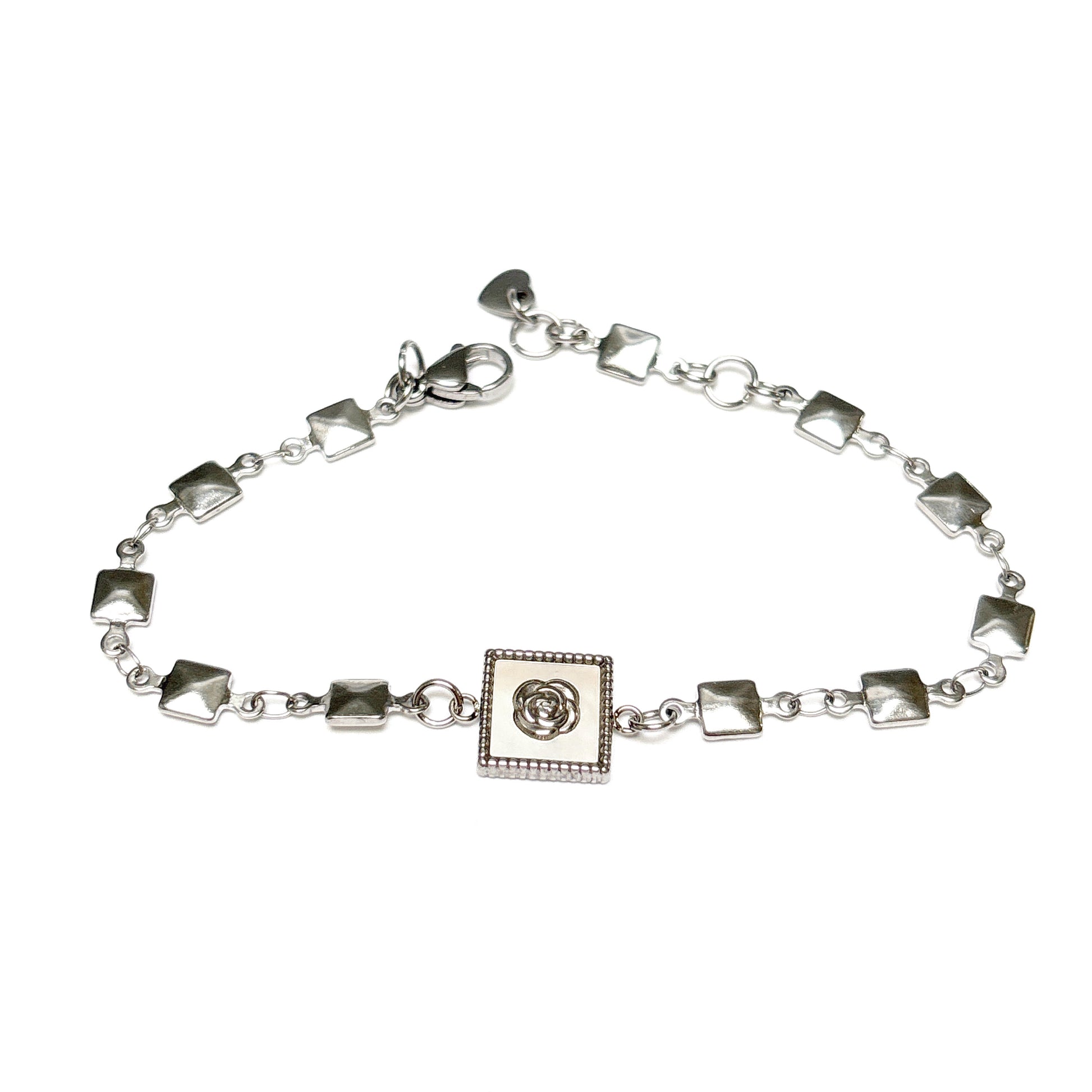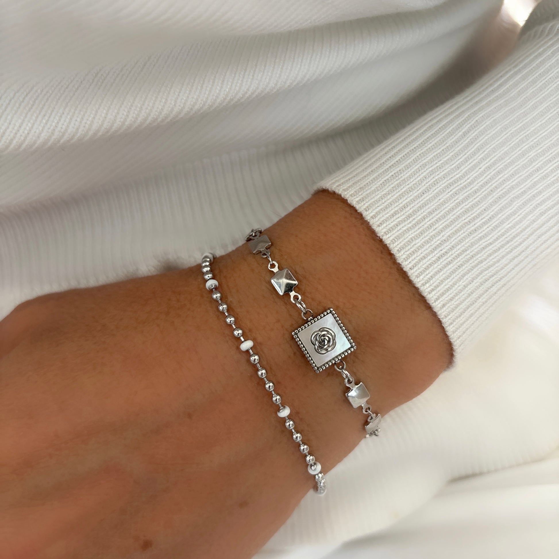 Transform your look with the elegant and modern ERENA 2 BRACELETS. Crafted from durable stainless steel, these bracelets feature a stunning square design adorned with a delicate shell and flower. The chic white enamel chain adds a touch of sophistication. Elevate any outfit with these beautiful bracelets and make a statement!