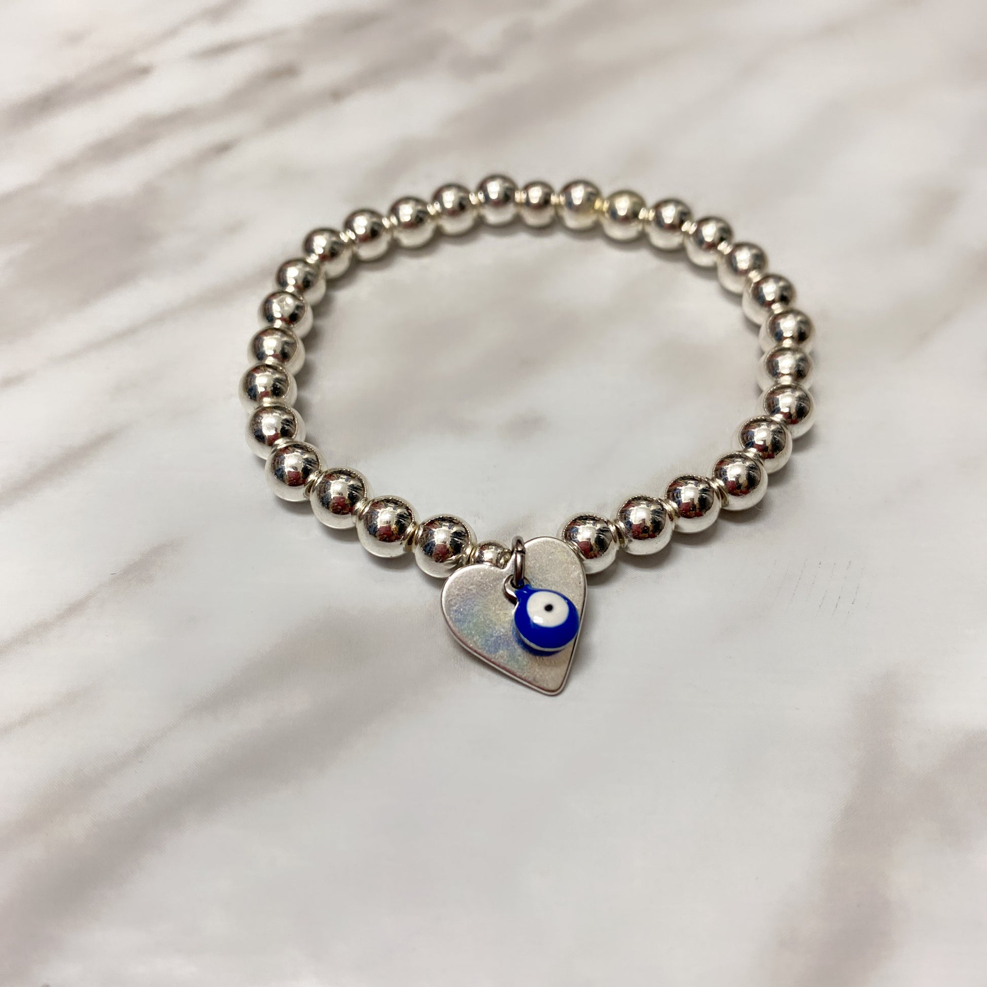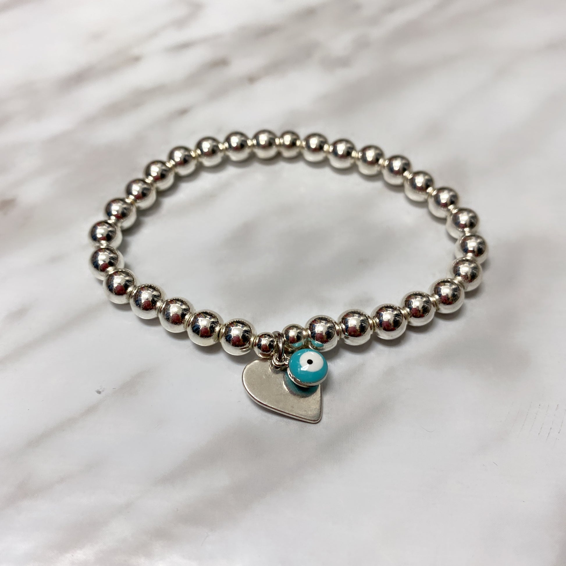 Hematite silver plated 6mm beads with dangling enamel eye & silver plated heart (stretch)