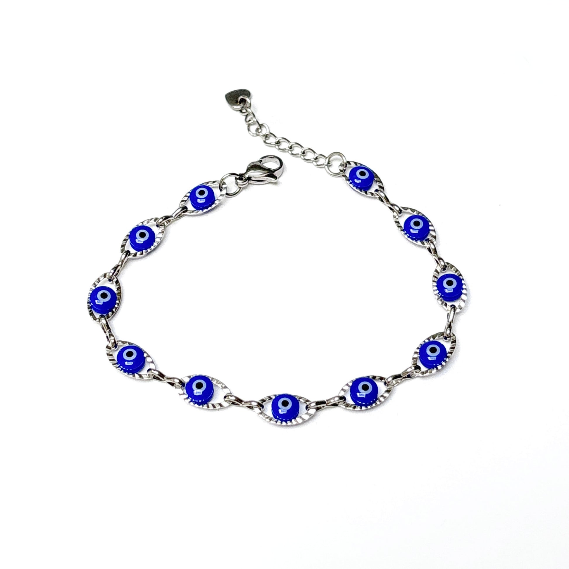 Discover the captivating beauty of EYES ON YOU BRACELETS. This stunning stack in Mykonos blue will elevate any outfit. Featuring a blue heart enamel bracelet, stainless steel evil eye bracelet, and a blue gemstone bracelet. Showcase your unique style with these eye-catching pieces.