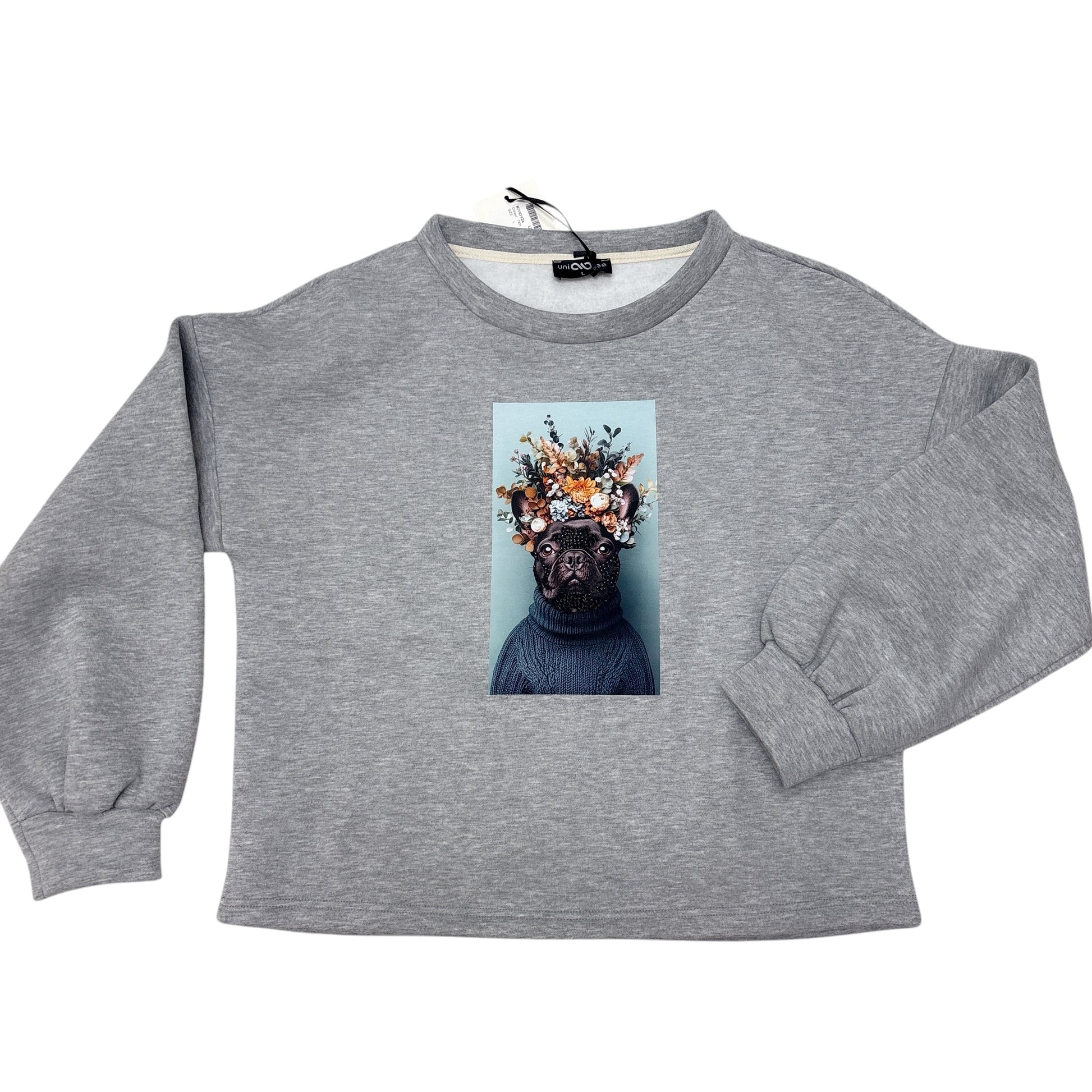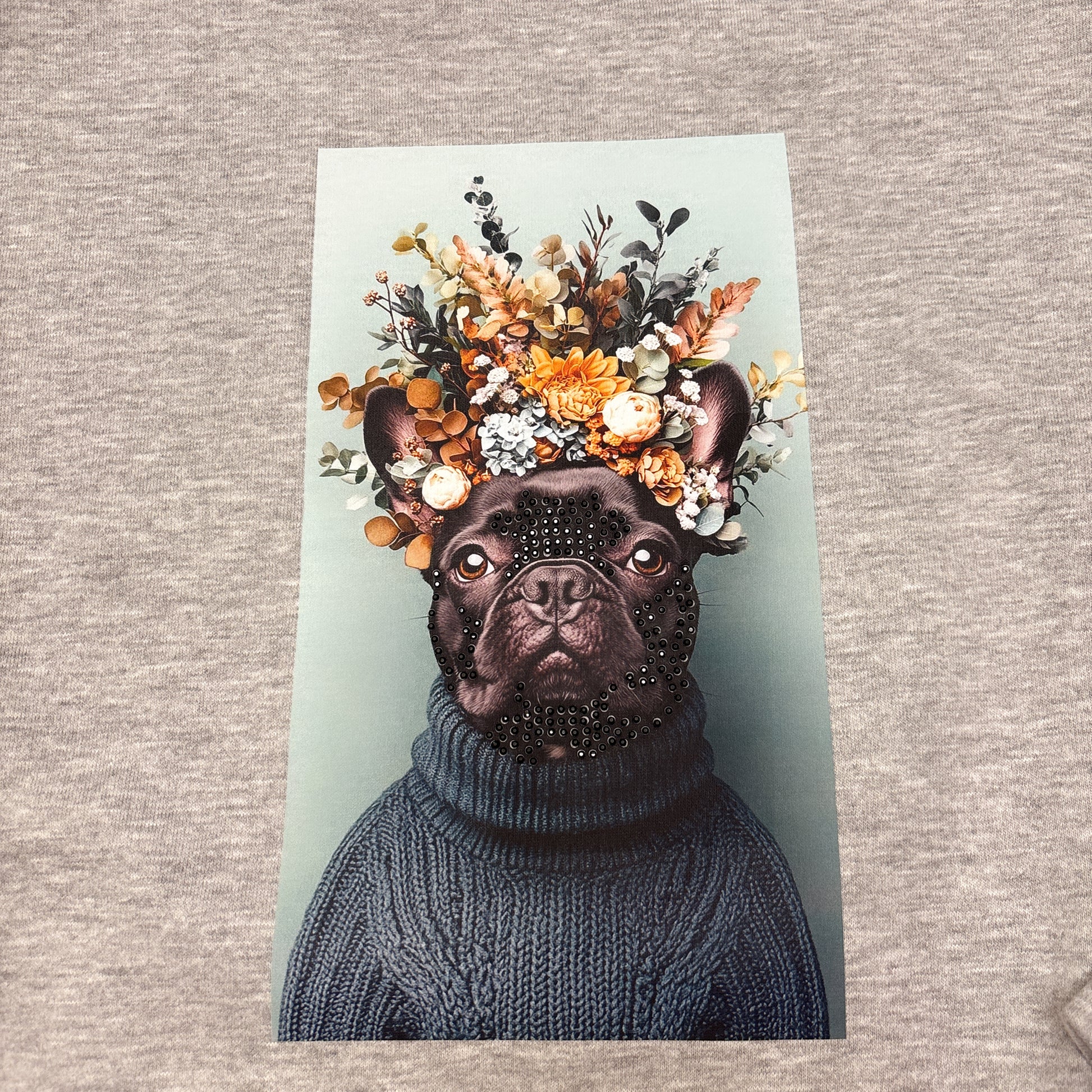 Wrap yourself in cozy comfort with this adorable French Bulldog sweatshirt. Crafted in a soft, grey fabric, it features an embellished pup design that's sure to turn heads. Perfect for dog lovers who want to show off their furry devotion in style. Snuggle up and let your love for frenchies shine through!