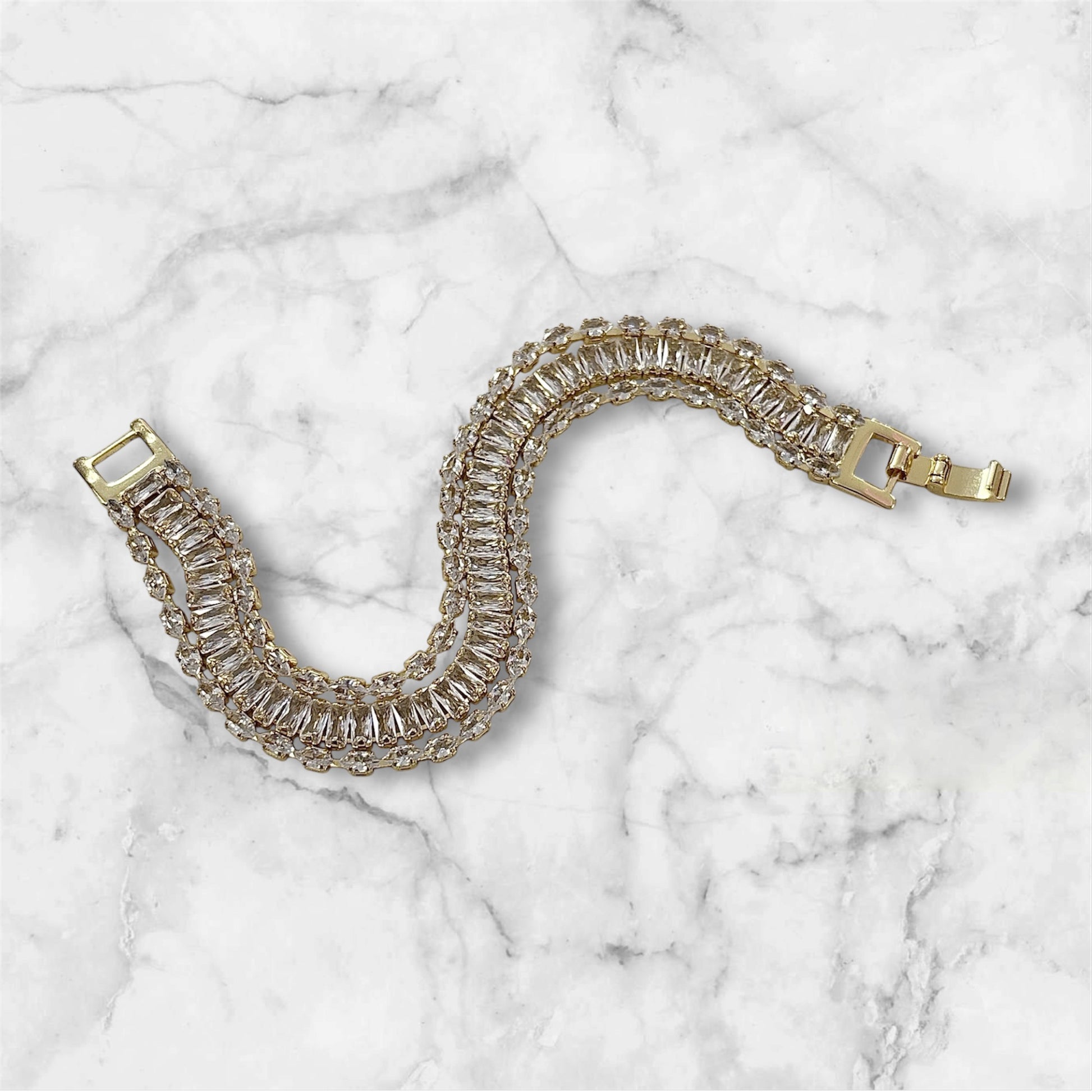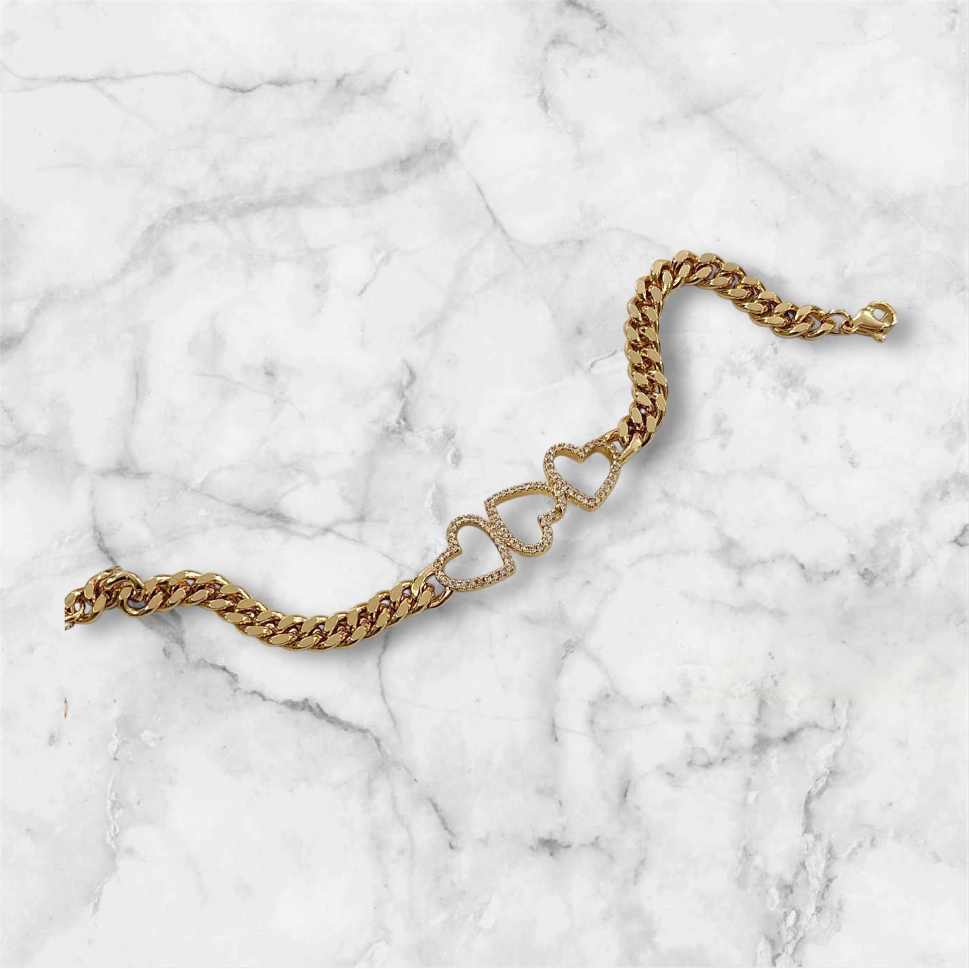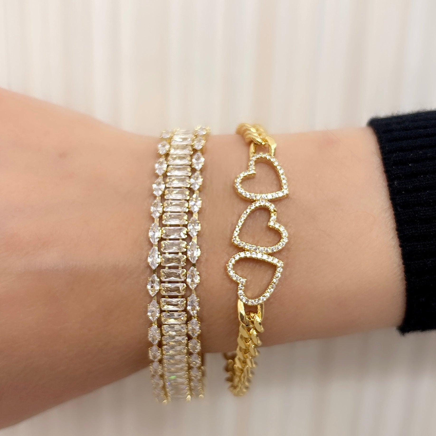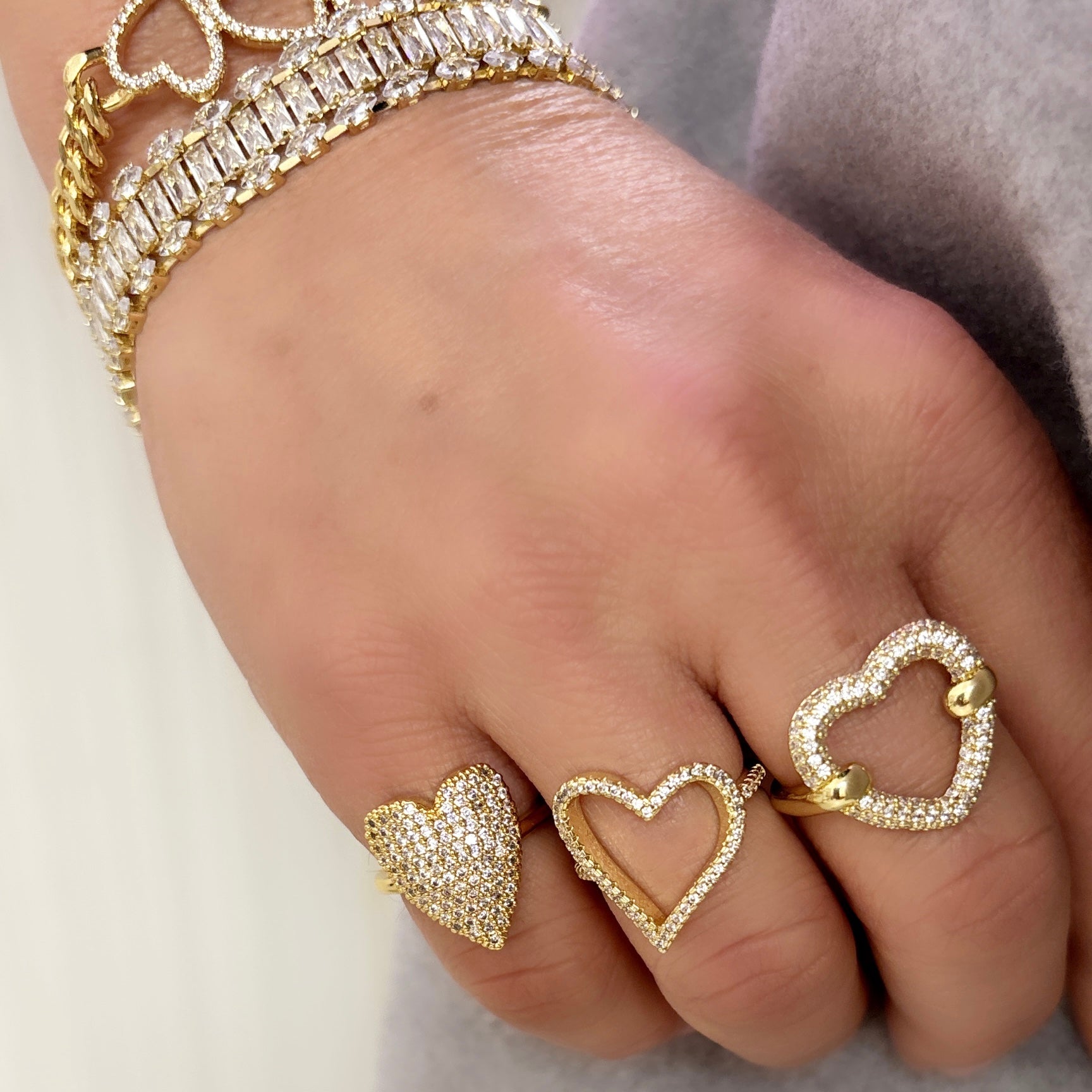 Add a touch of glam to any outfit with our sparkling Harley Bracelets and Rings. The layered chain design features a 3-heart chain and a triple chain tennis style, adorned with shimmering cubic zirconia. Choose one or all 3 heart rings for a statement look that shines bright like a diamond. Available now!
