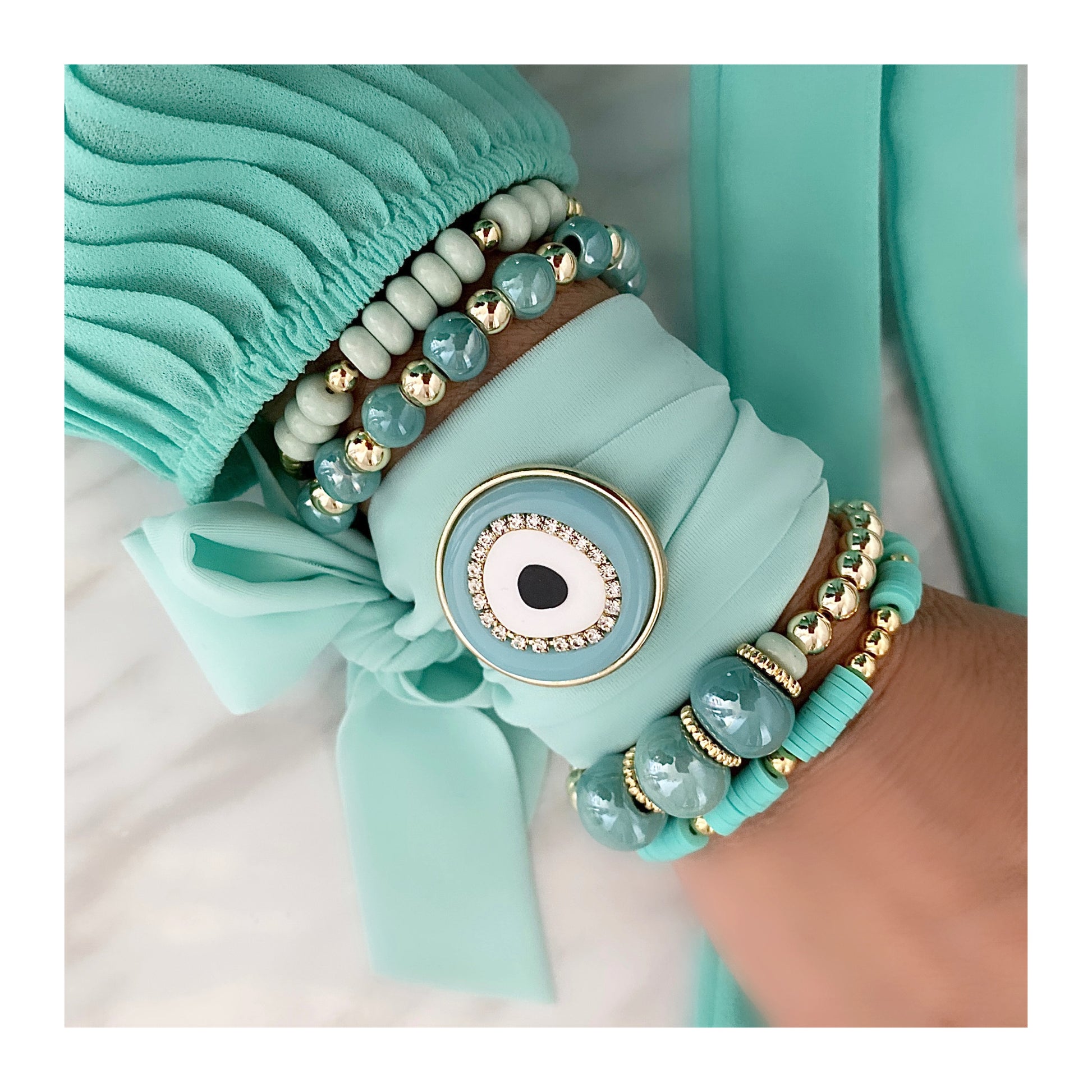 Gold plated hematite beads, ceramic beads gemstones and evil eye charm.