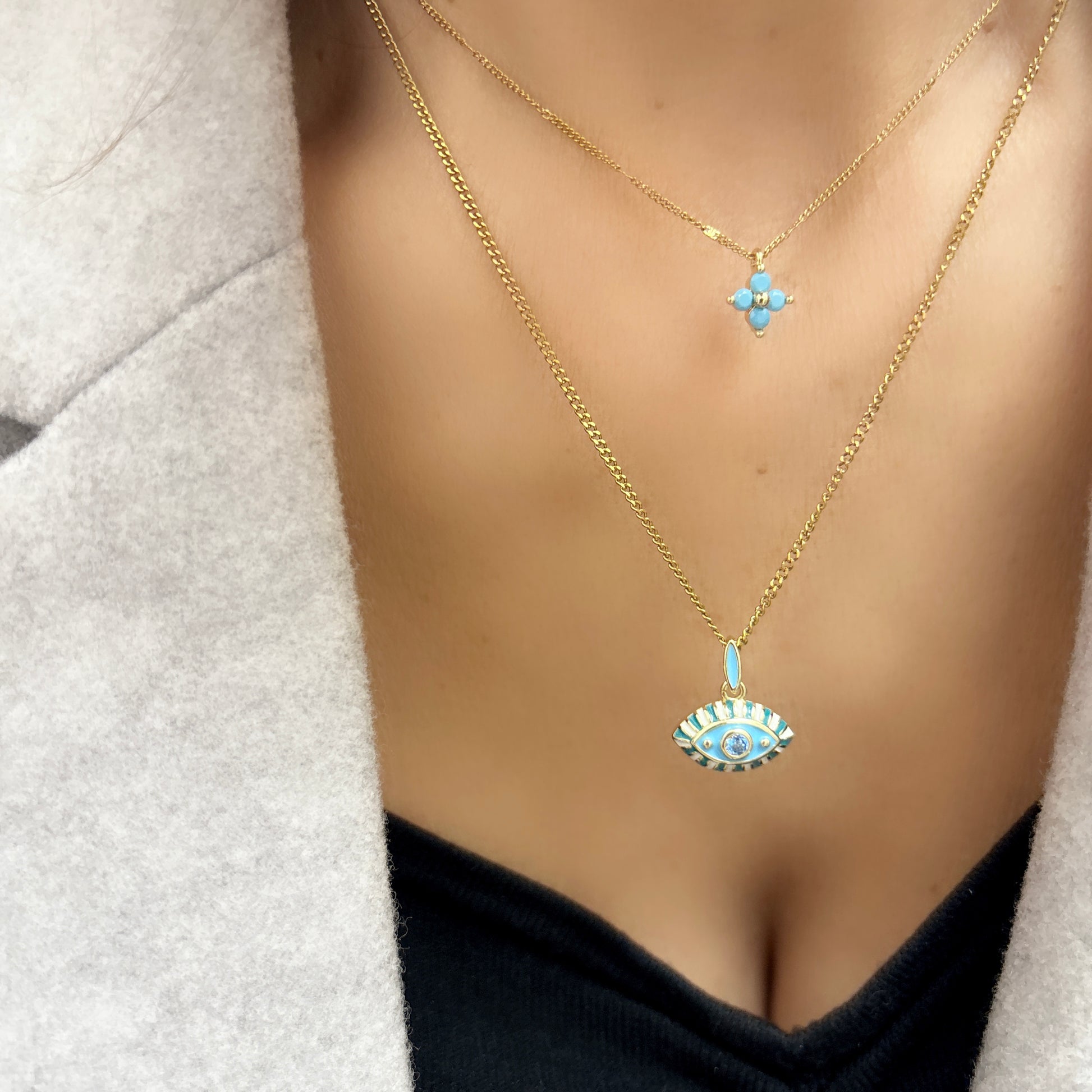 Elevate your accessory game with IOS Necklaces. Each sold separately, these dainty layered necklaces feature a delicate turquoise cross and evil eye, evoking the beauty of the Greek islands. Enhance any ensemble with a touch of elegance and exclusivity.