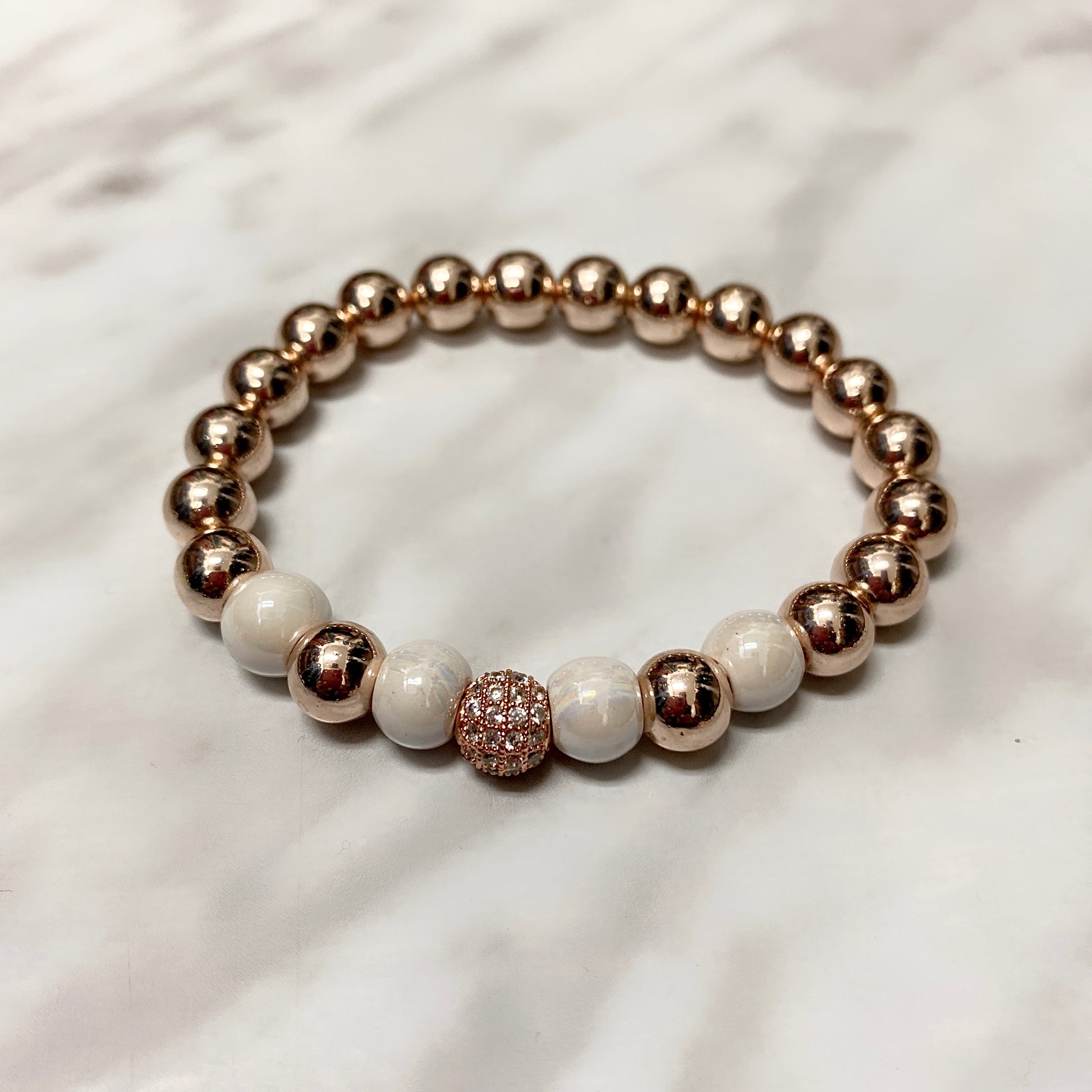 Lovely rose gold and pearly white stack of bracelets. Sold separately, but grouped together for a complete statement look. They are beautiful enough to be worn single as well.