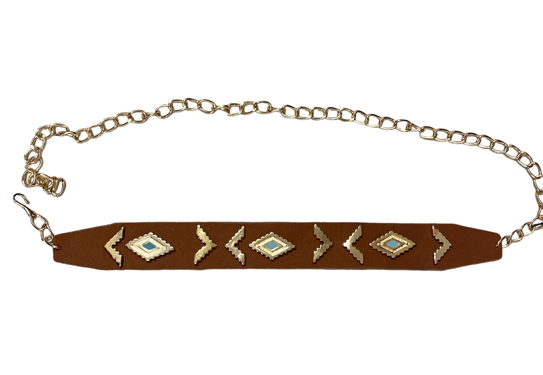 Stunning brown leather and gold chain belt with beautiful hard wear. It will dress up any outfit!