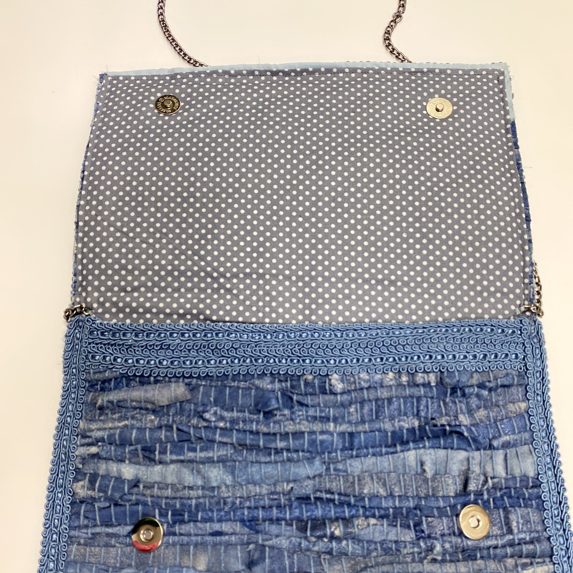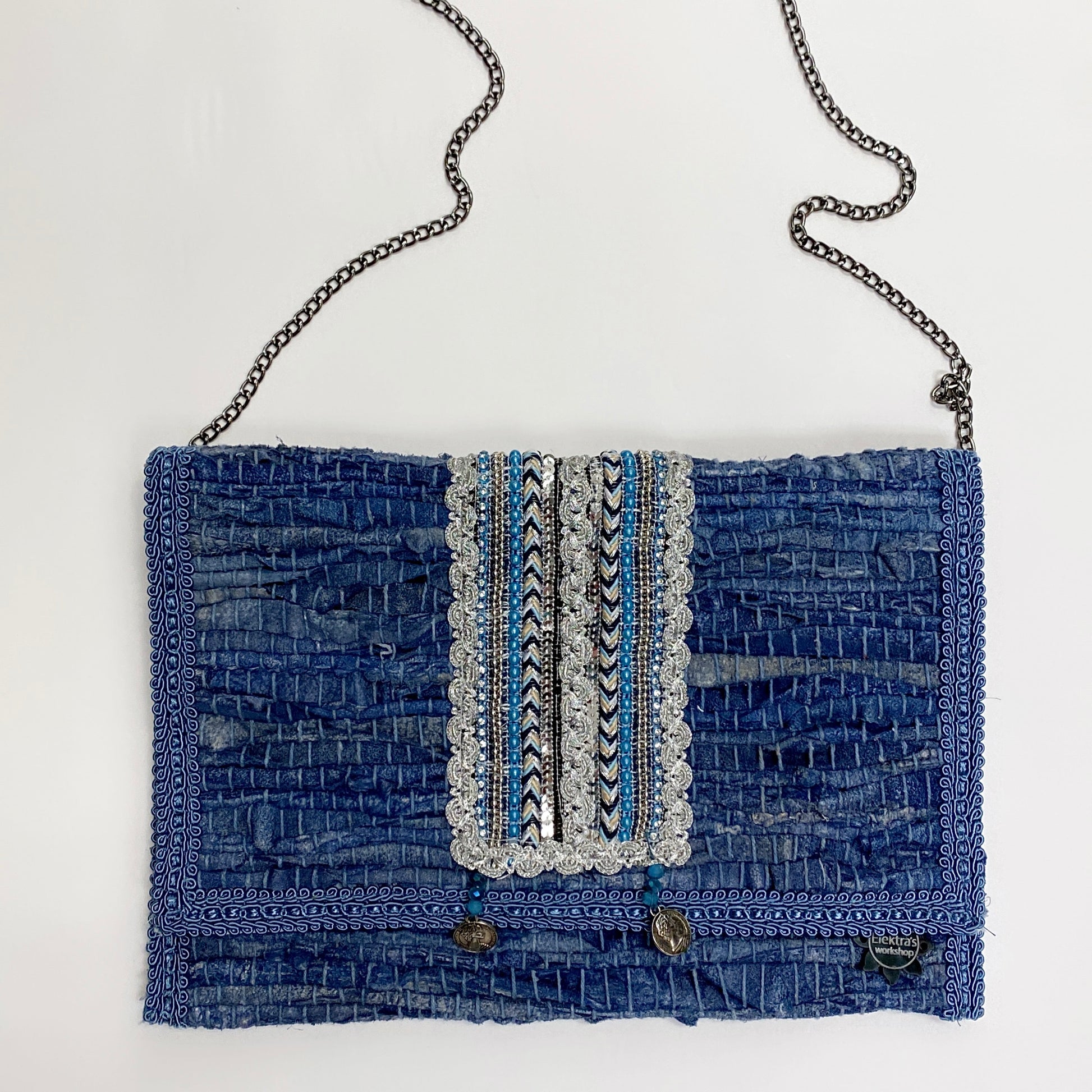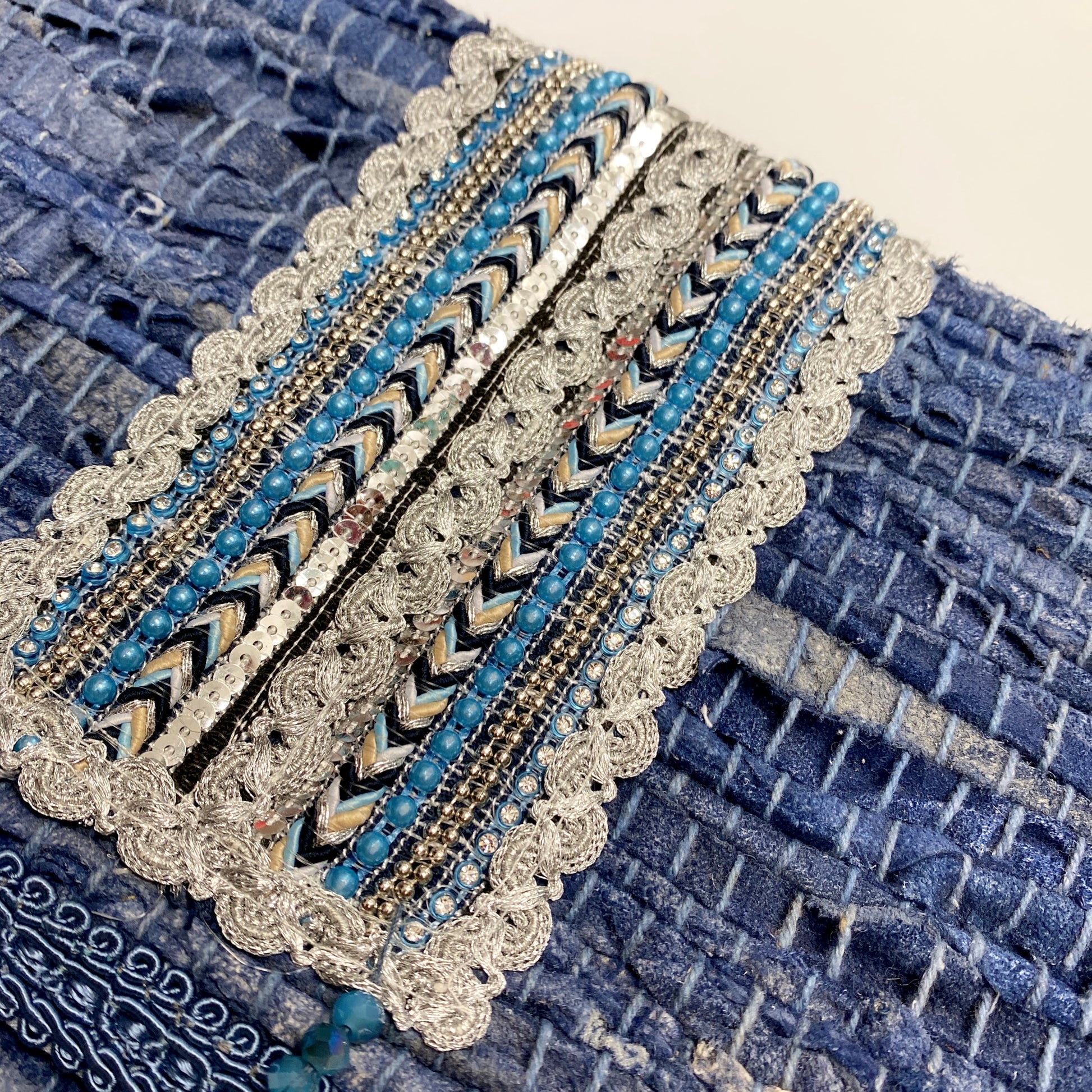 Blue leather kourelou style bag with thick runner adorned with beads & sequence and 2 coin embellishments and chain handle.