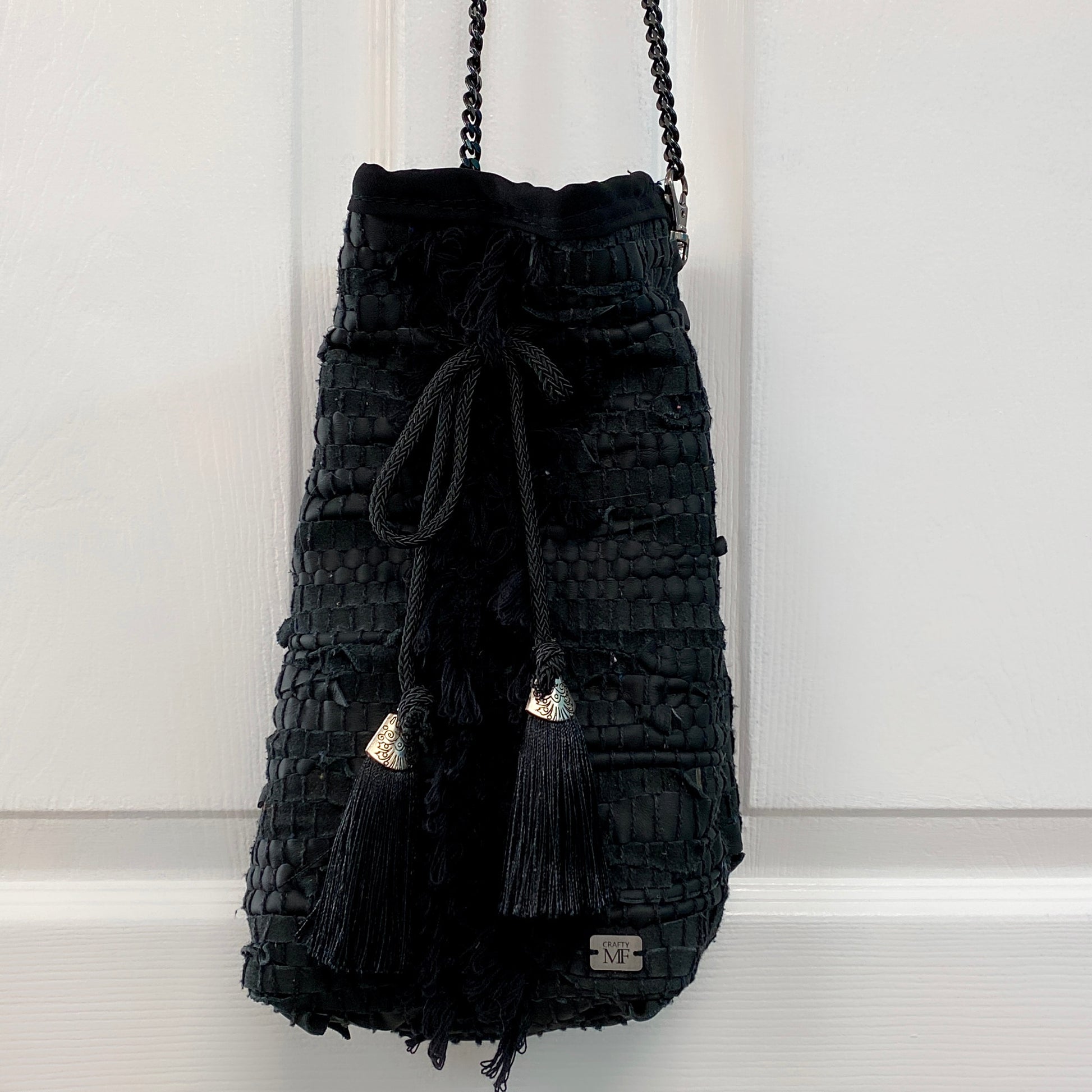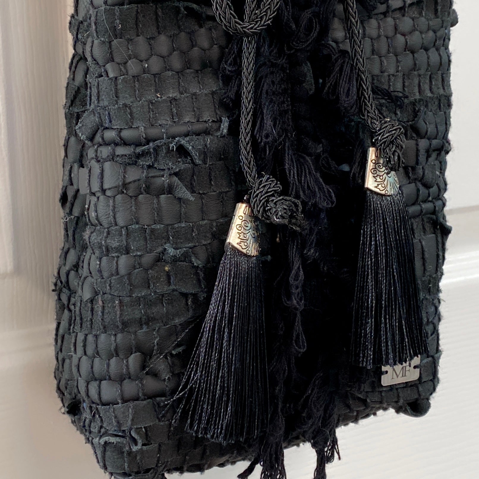 Black kourelou style handmade leather, small bucket bag. Beautifully decorated with tassels. Imported and handcrafted in Greece. Original design and maximum two of a kind
