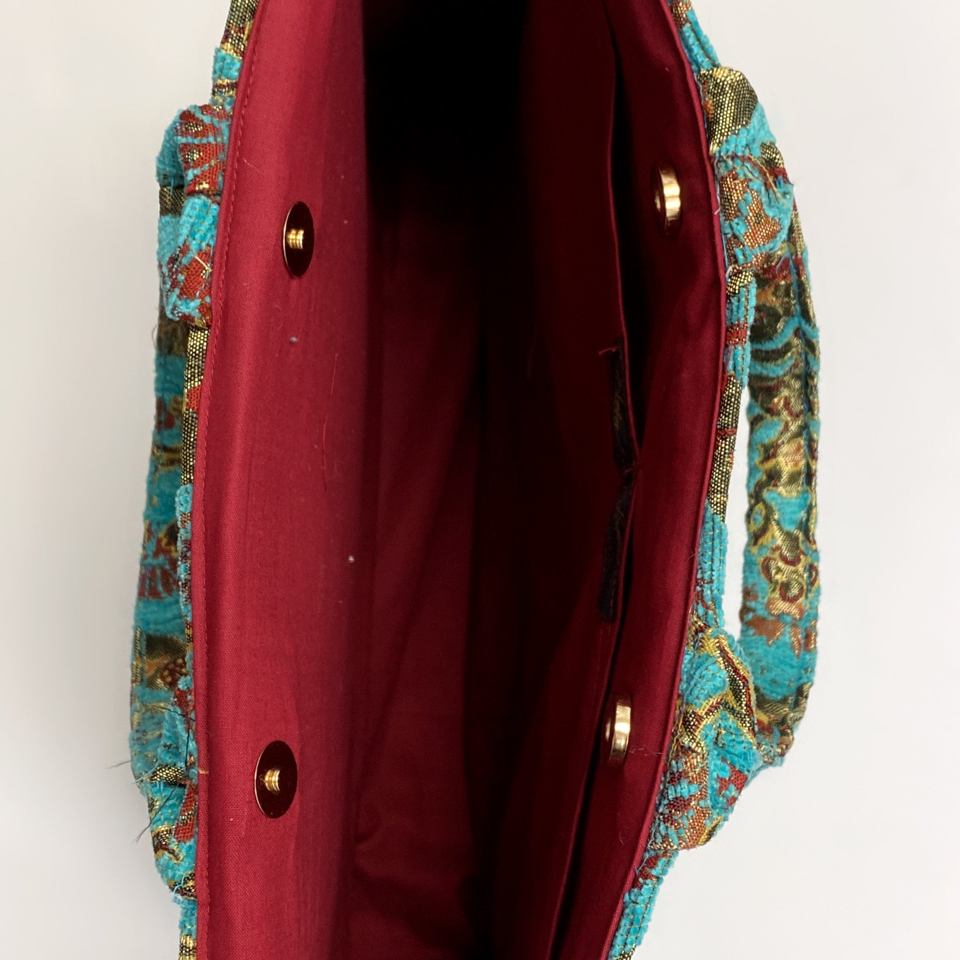 Turquoise with maroon and gold accents tapestry fabric handmade bag with floral pattern. Elegant enough to bring to a function and carry that second pair of comfortable shoes!