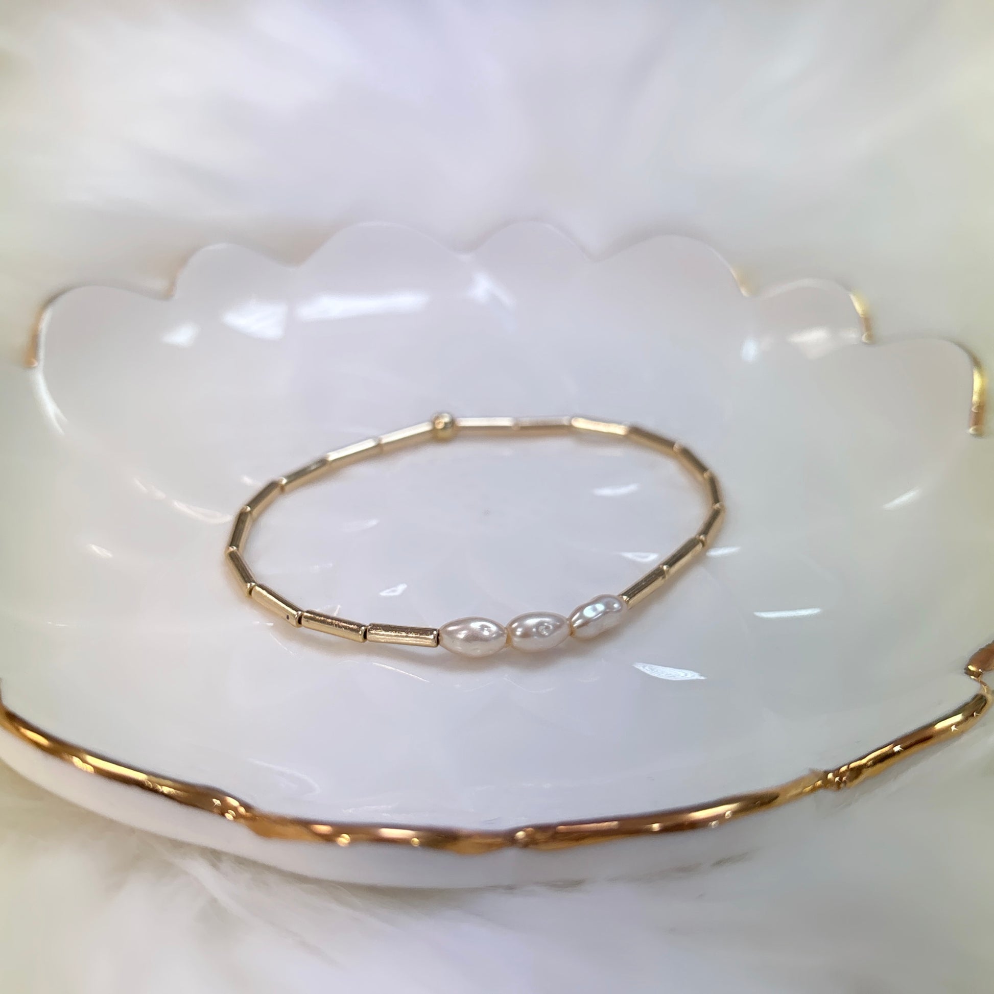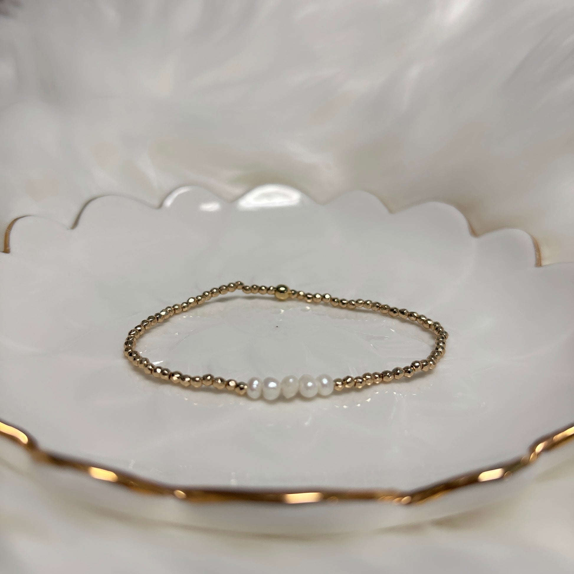 A Beautiful dainty stack with golden tones, pearls and turquoise.