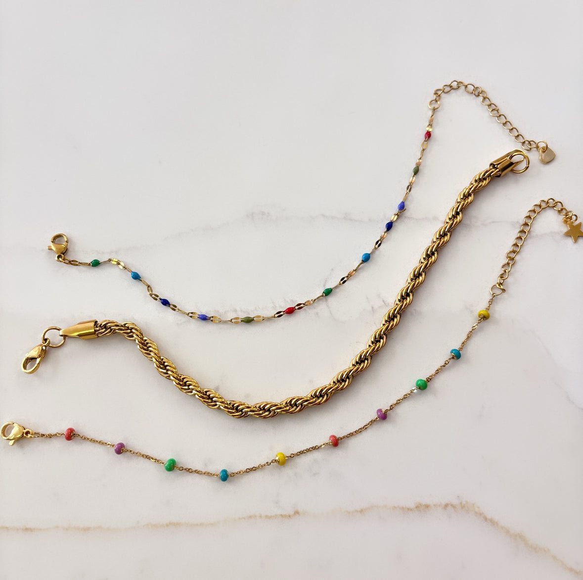 Stack these stunning stainless steel bracelets for instant wrist magic! This trio features a delicate chain adorned with oval enamel accents, a twisted rope design for texture, and another dainty chain showcasing round colorful enamel details. Gold-plated for that luxe finish, mix and match or wear them together for a bold, vibrant look. Perfect for layering lovers who crave personality and sparkle!