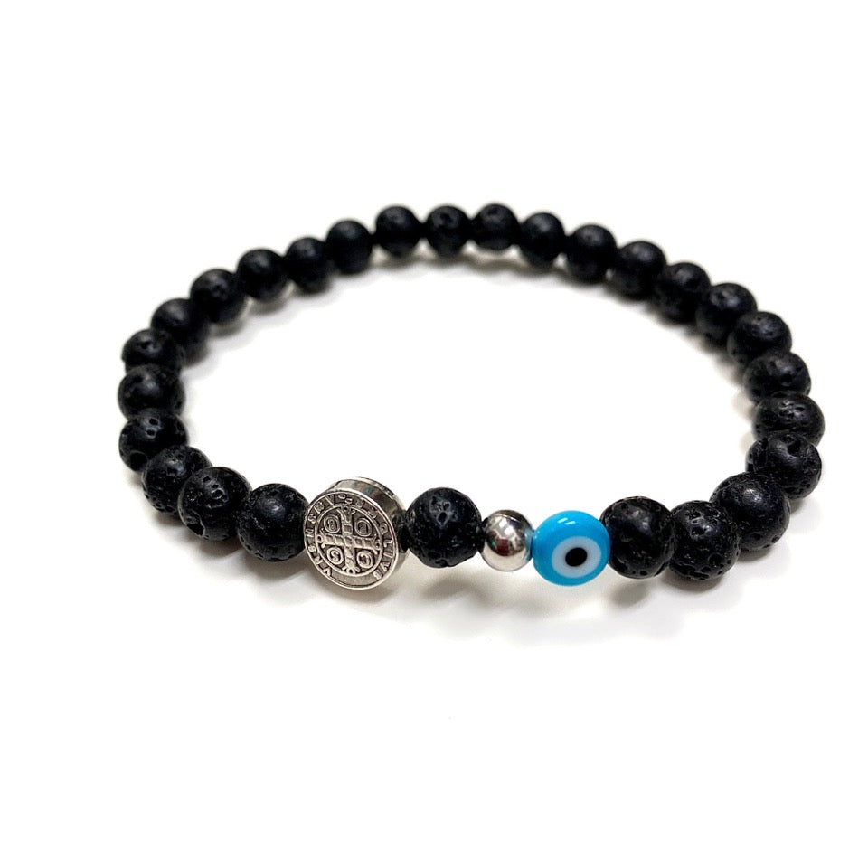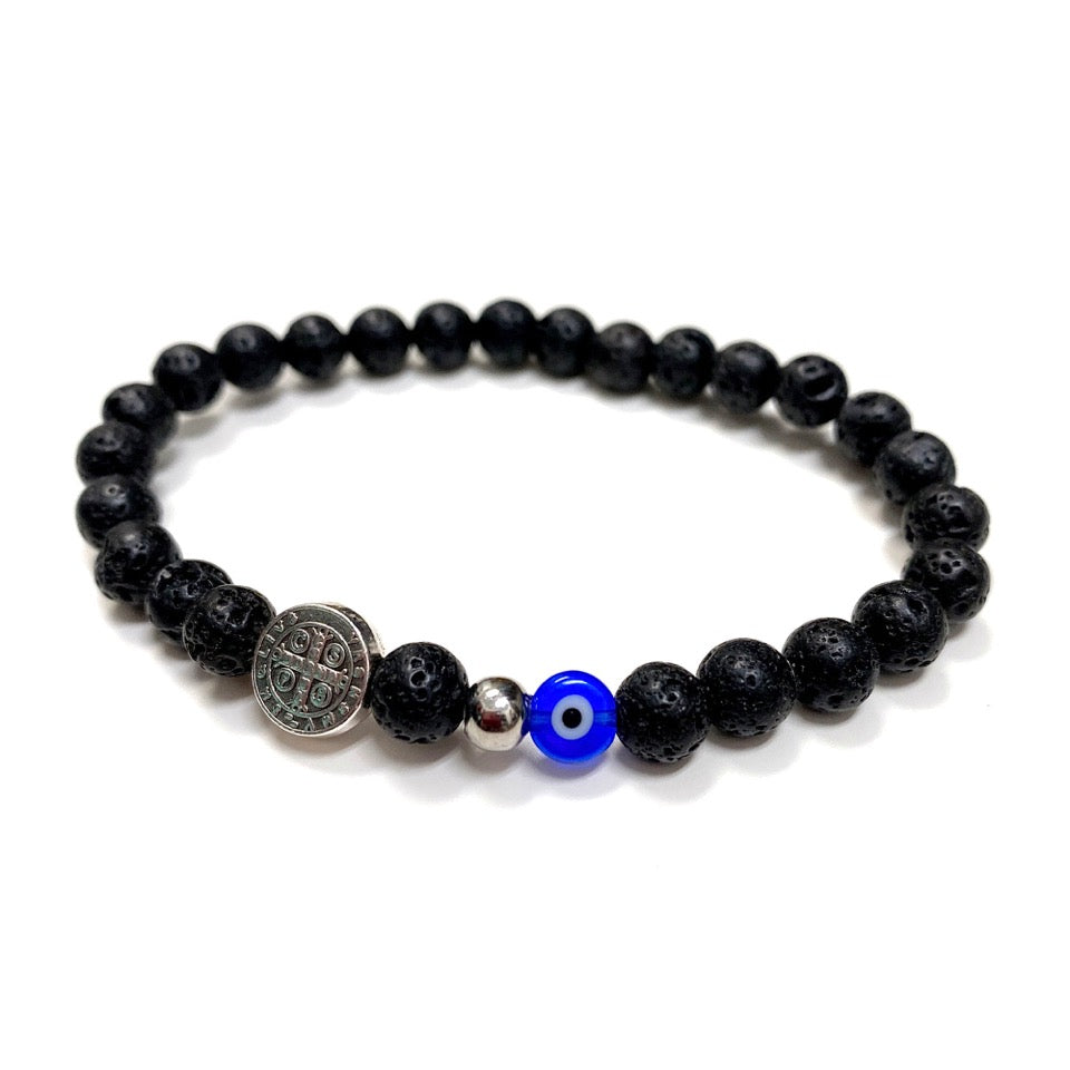 Men's black lava beads 6mm with silver plated bead with cross design, stainless steel bead & small glass eye bead.