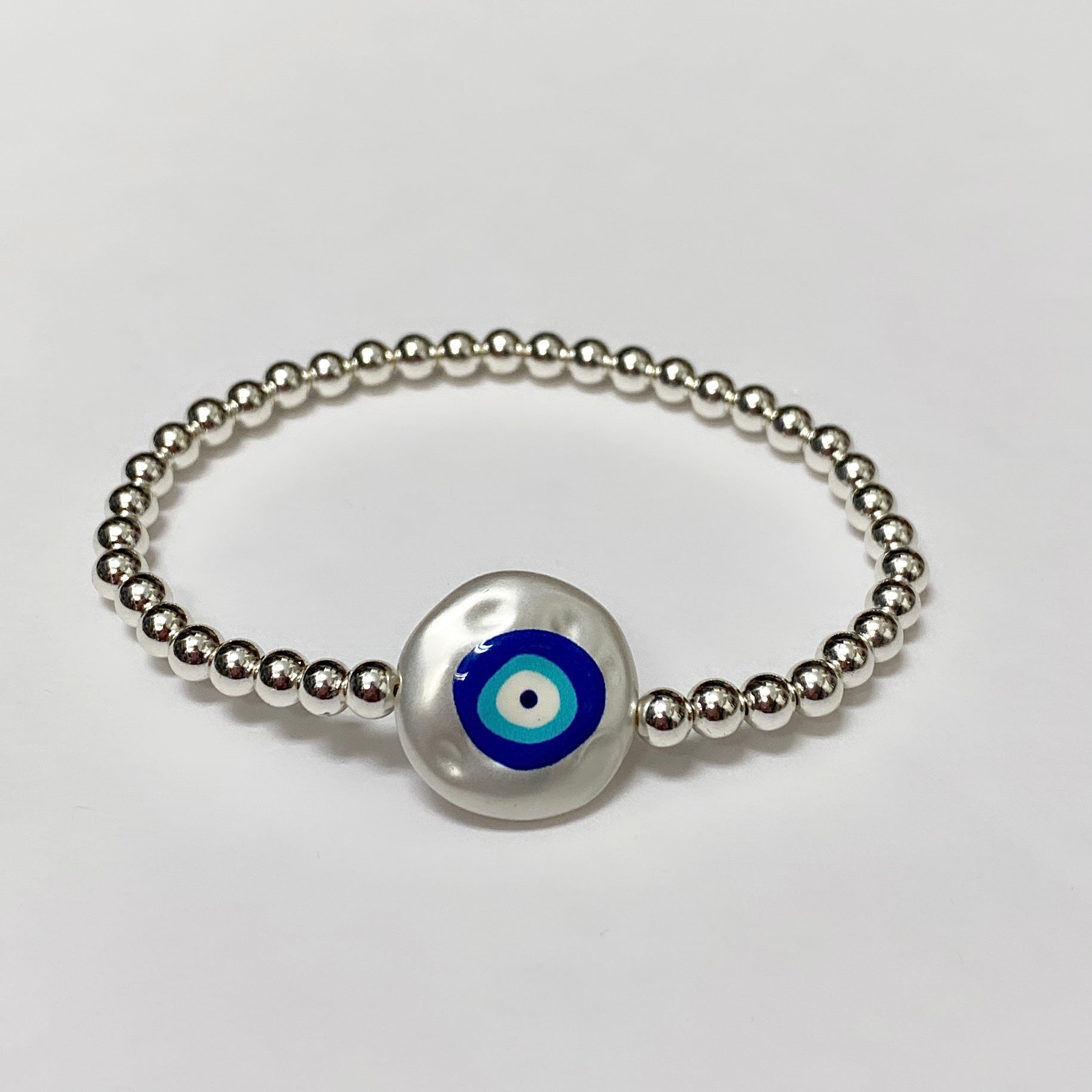 #1 Hematite silver plated 4mm bead with faux pearl eye (stretch),