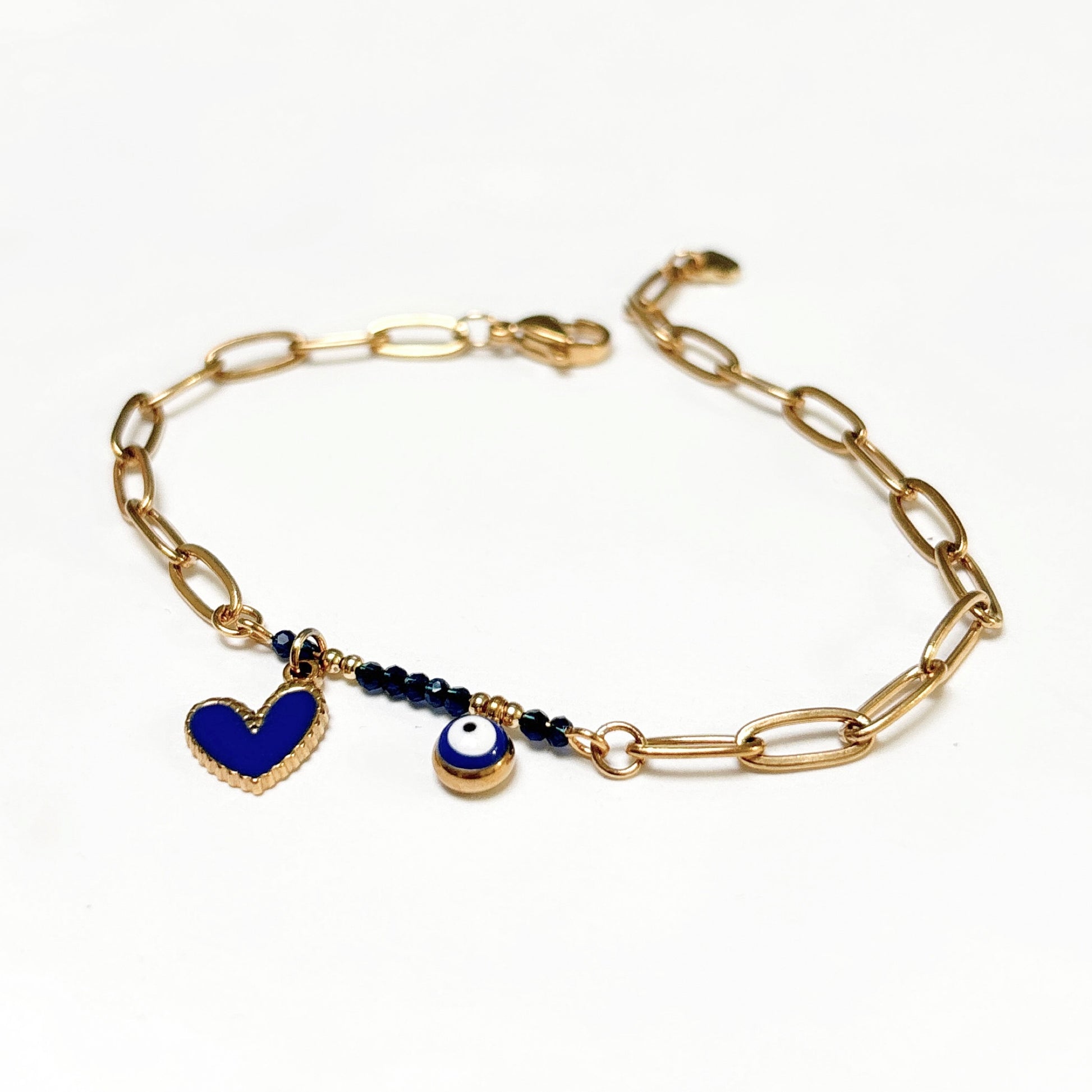 3. Paperclip charm bracelet with heart and evil eye (8" total length)