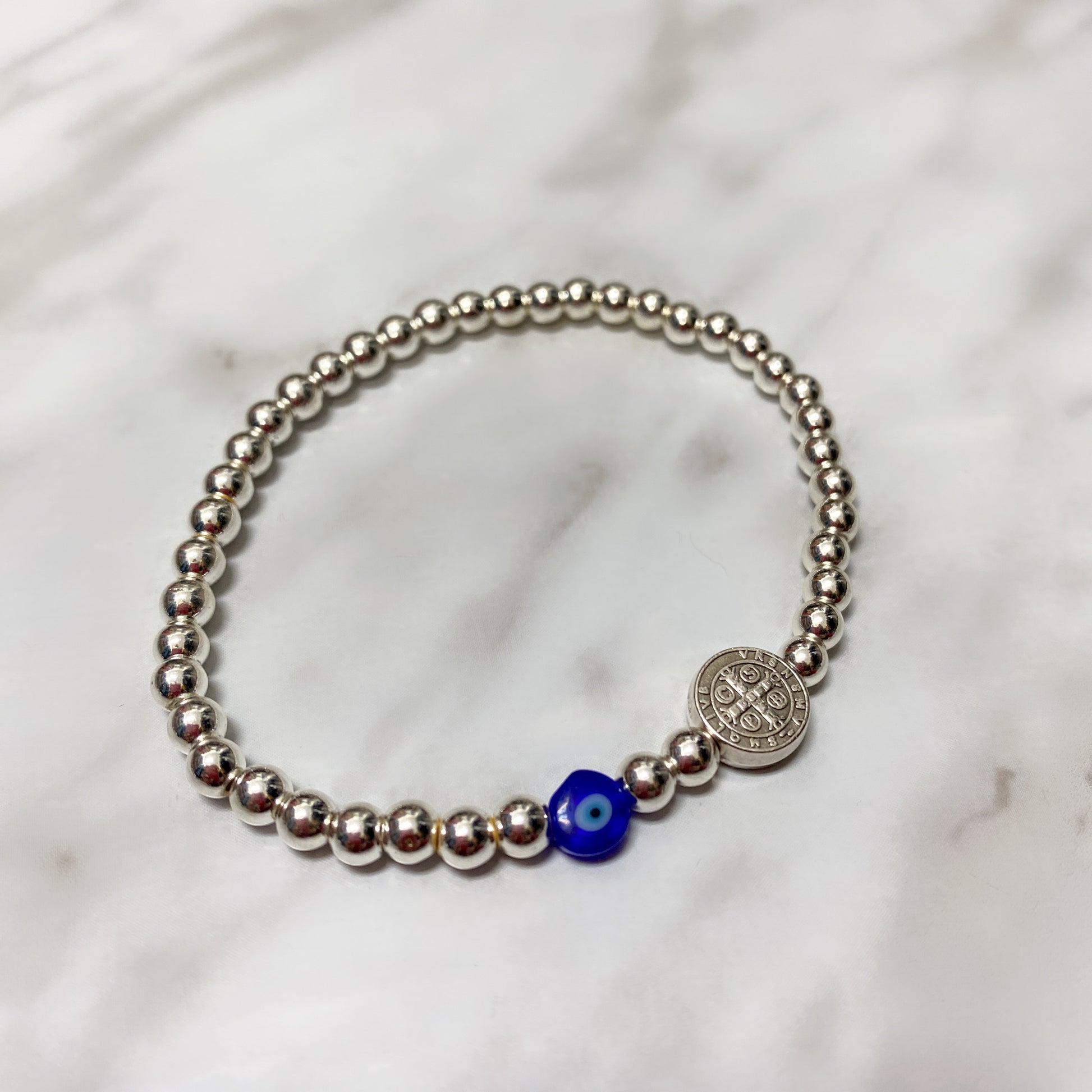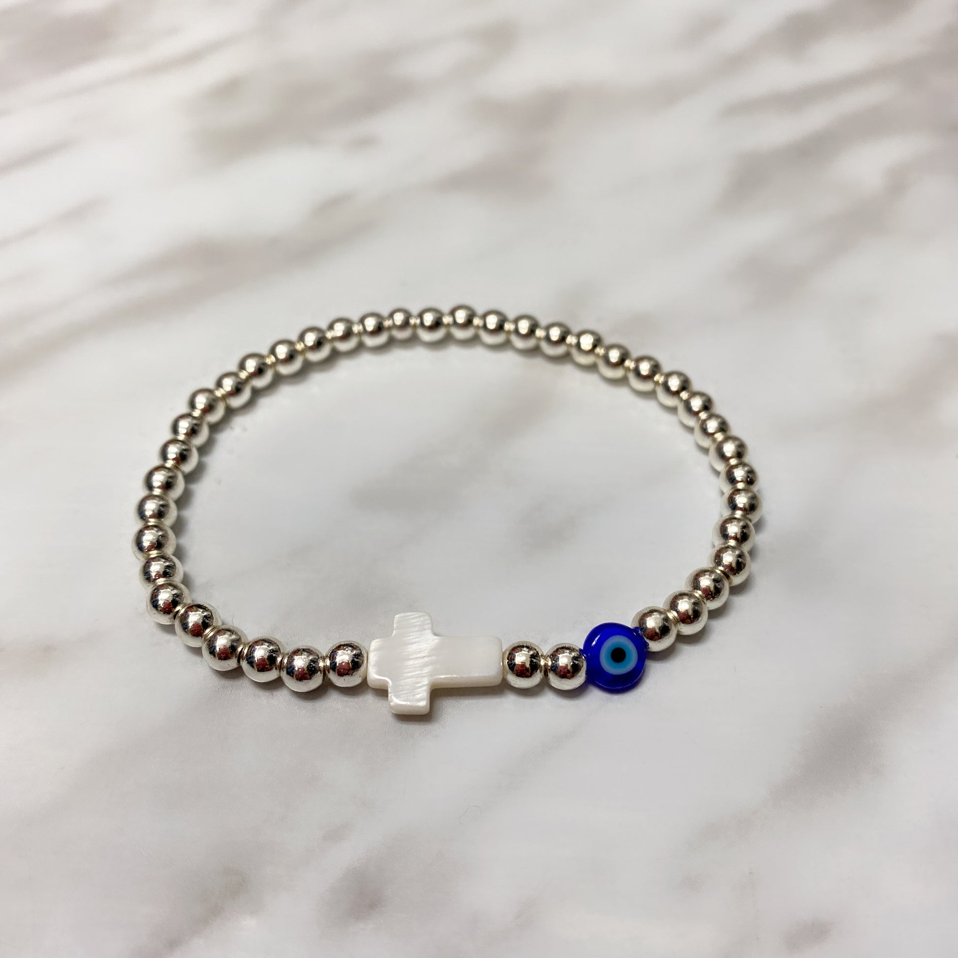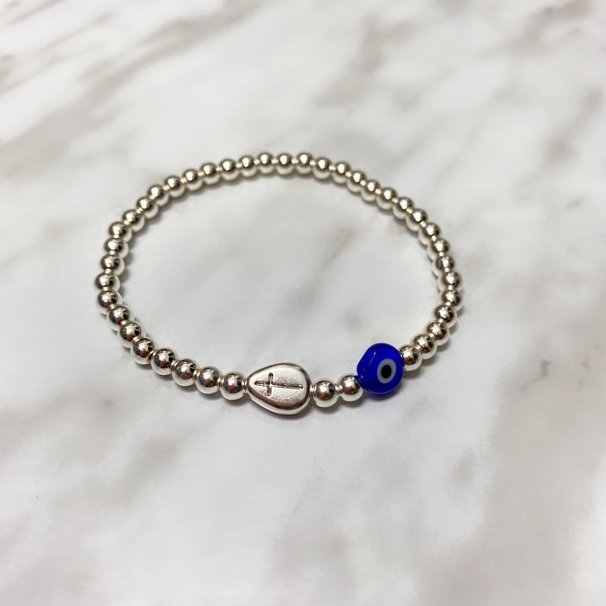 Hematite silver plated bead bracelets with a variation of crosses and eyes (stretch)