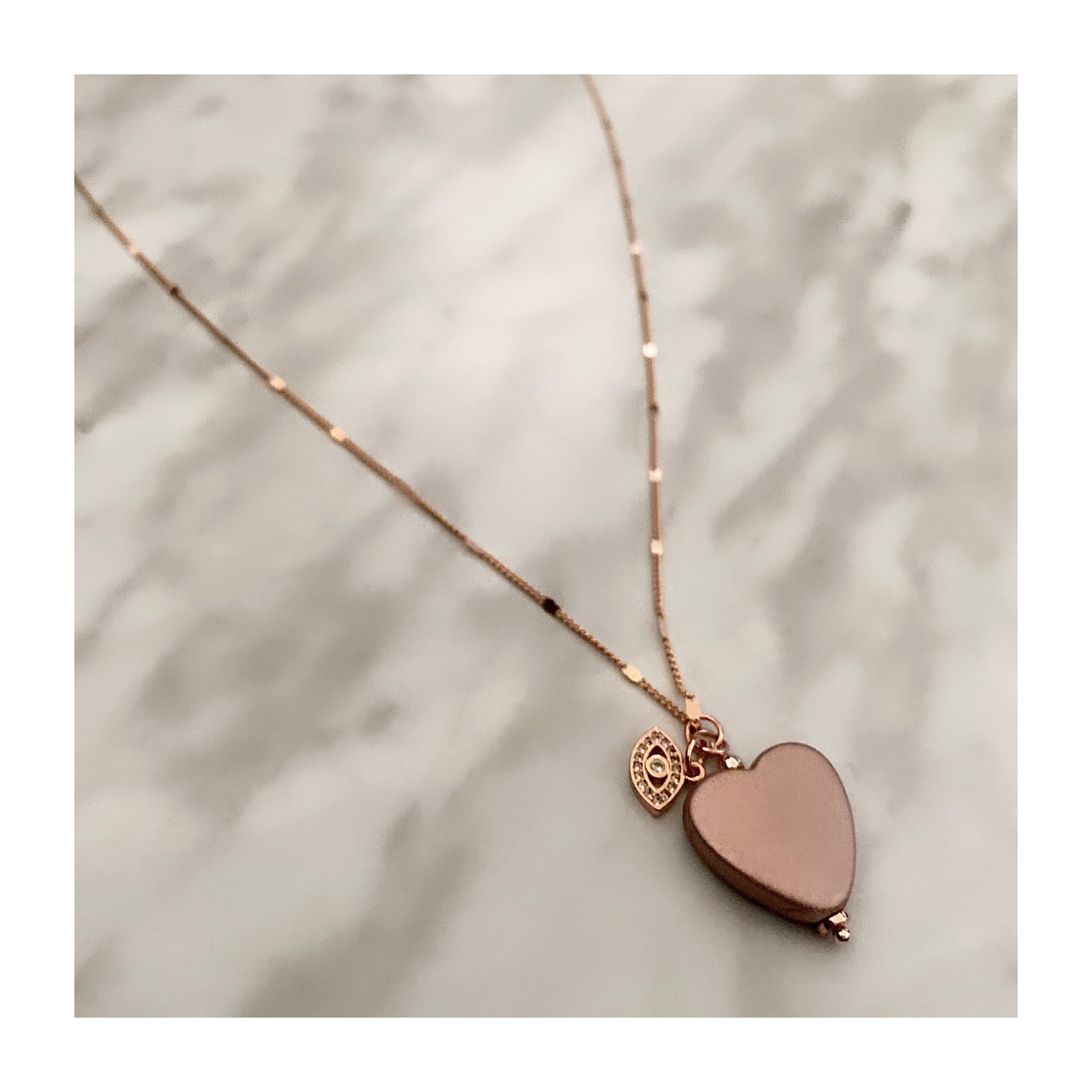#9 Brass rose gold plated chain necklace with matte rose heart & cz eye charm measuring 20 inches with extension,