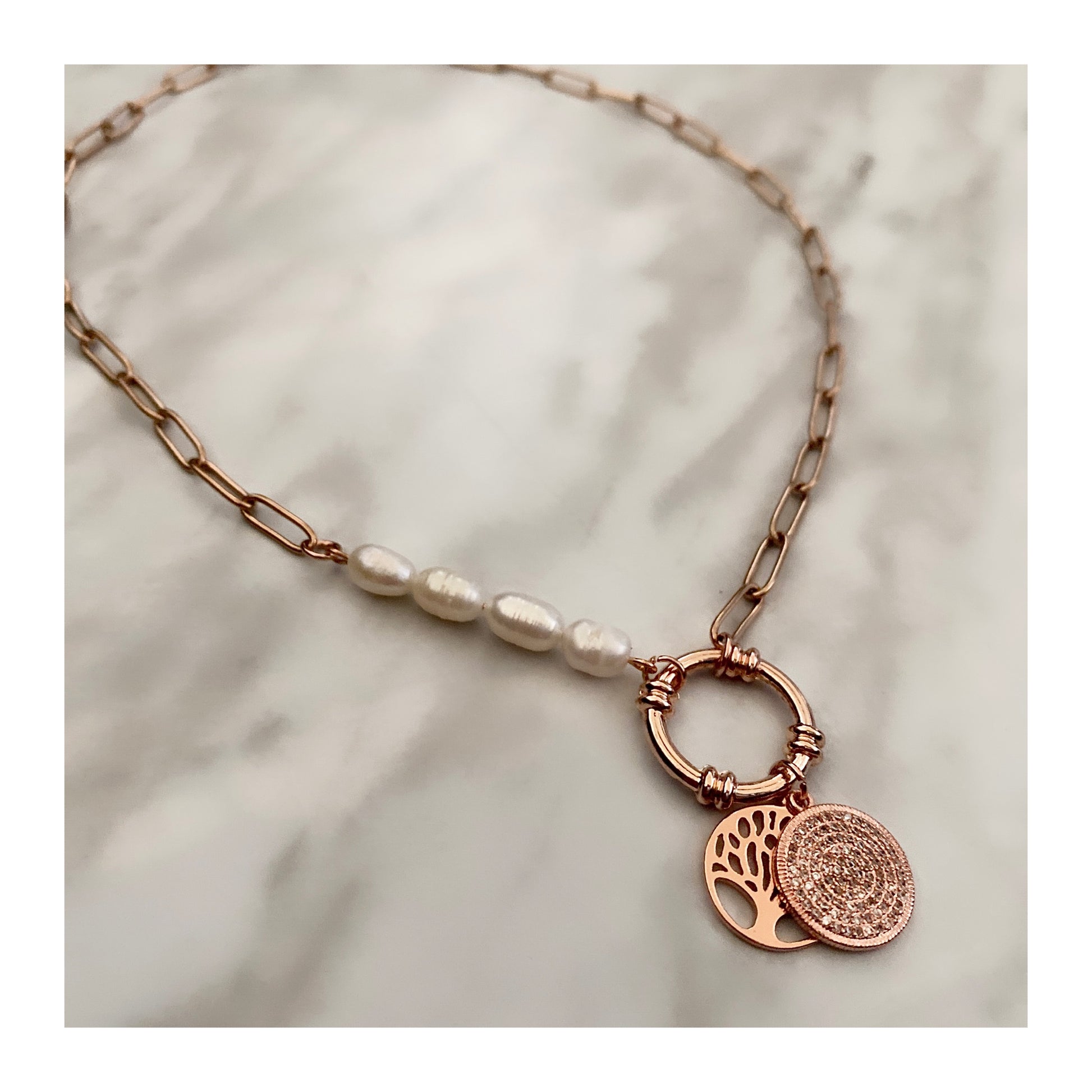 #8 Fresh water pearl and stainless steel rose gold plated chain necklace with rose gold plated charms measuring 17 inches,