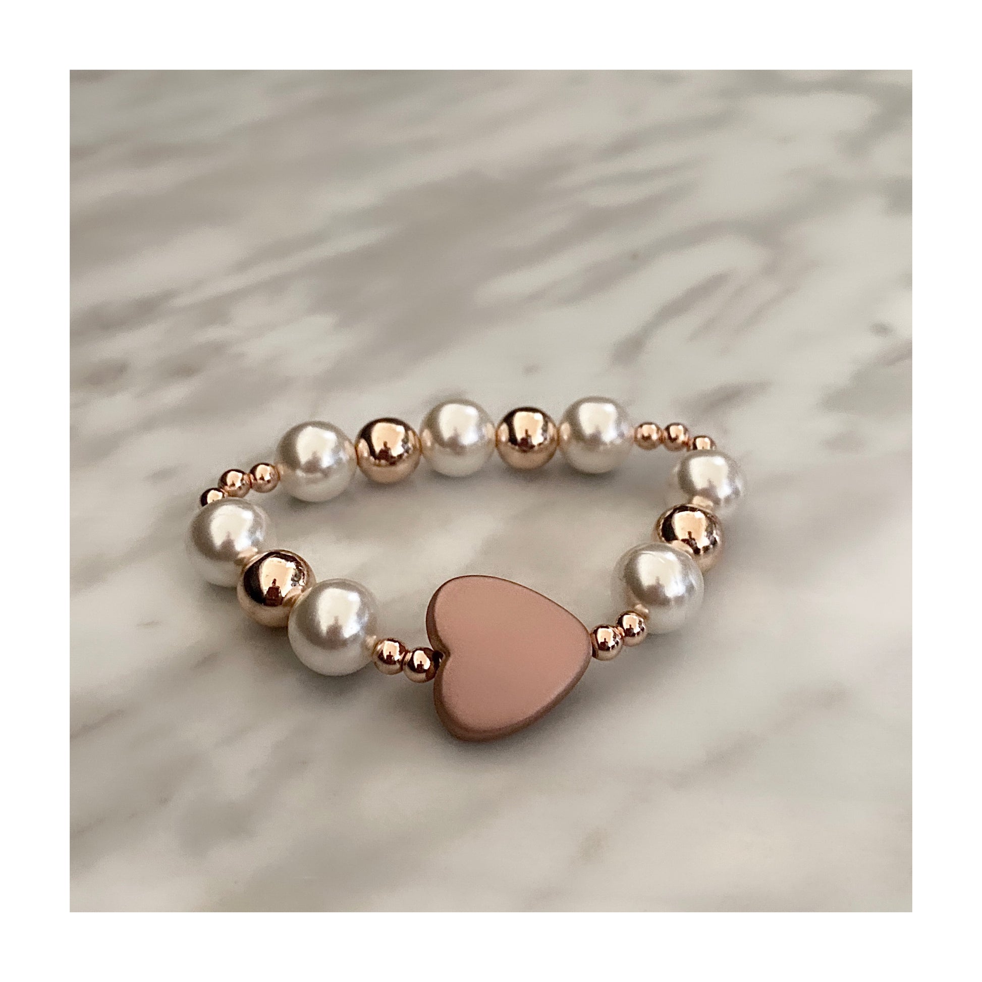 #6 Faux pearl & hematite rose gold plated 8mm + 4mm with acrylic matte rose heart centre (stretch),