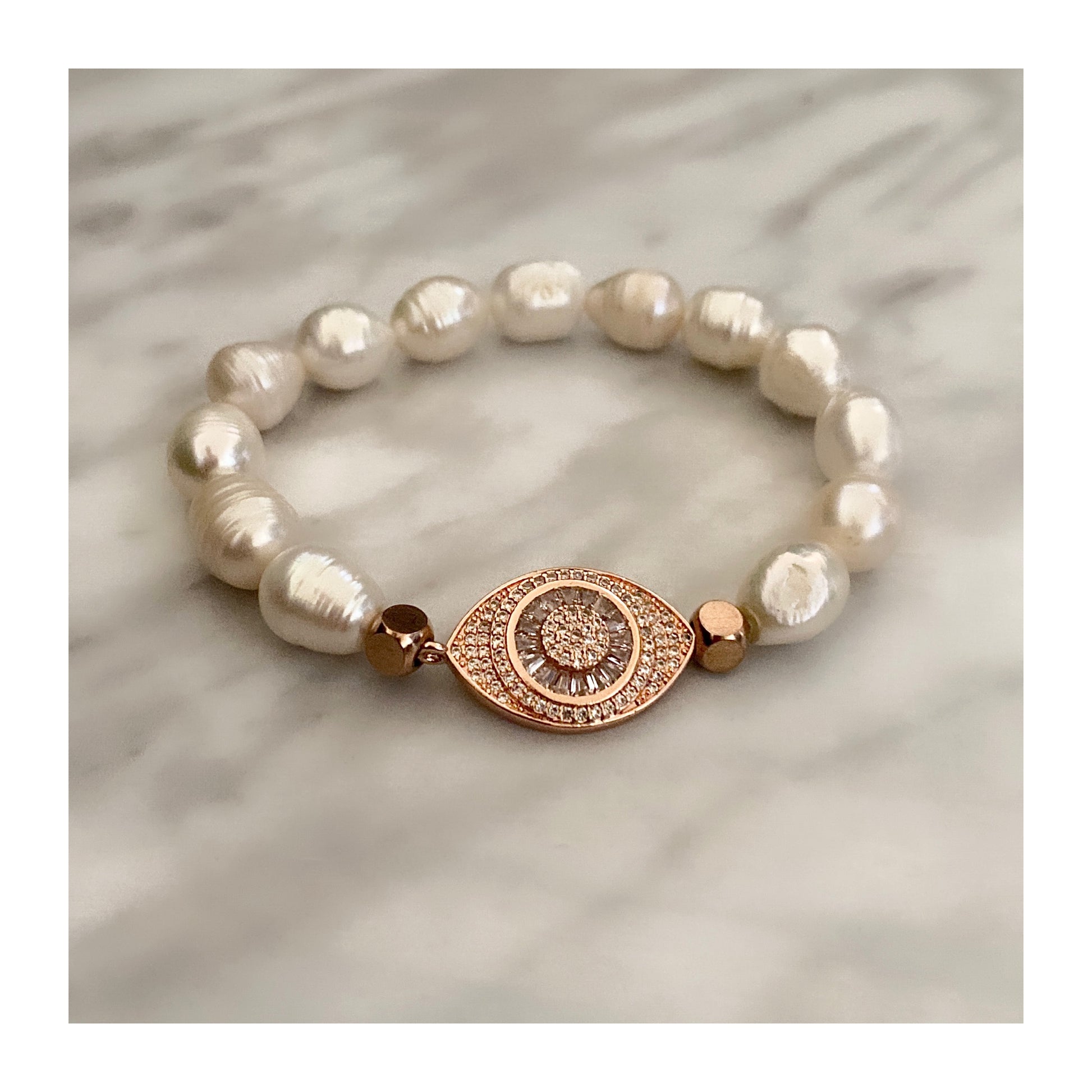 #3 Fresh water pearl strand with brass rose gold plated cz eye (stretch),