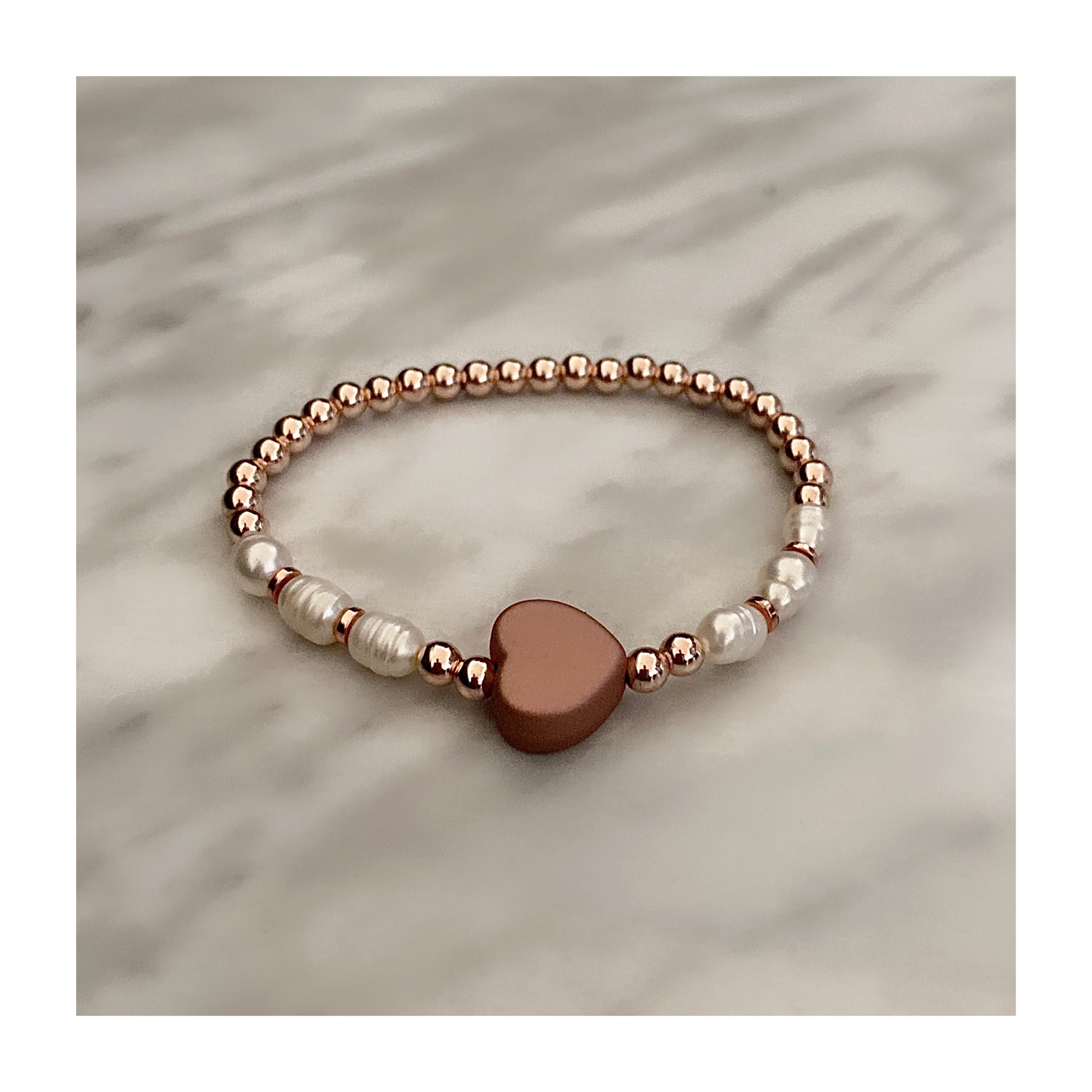 #1 Rose gold plated hematite beads 4mm with fresh water pearl and acrylic matte rose heart (stretch),