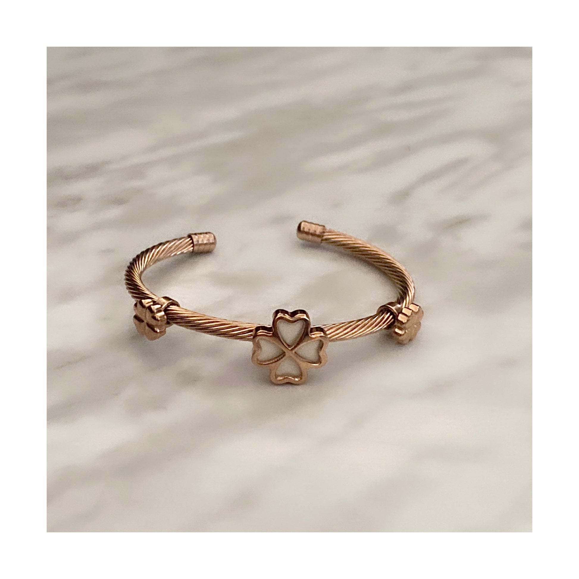 #7 Rose gold plated rope style cuff adorned with stainless steel with enamel 4 leaf clover,