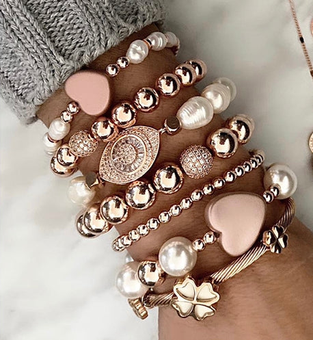 A stunning rose gold and variety of pearls stack of bracelets. Sold separately, but grouped together for a complete statement look.