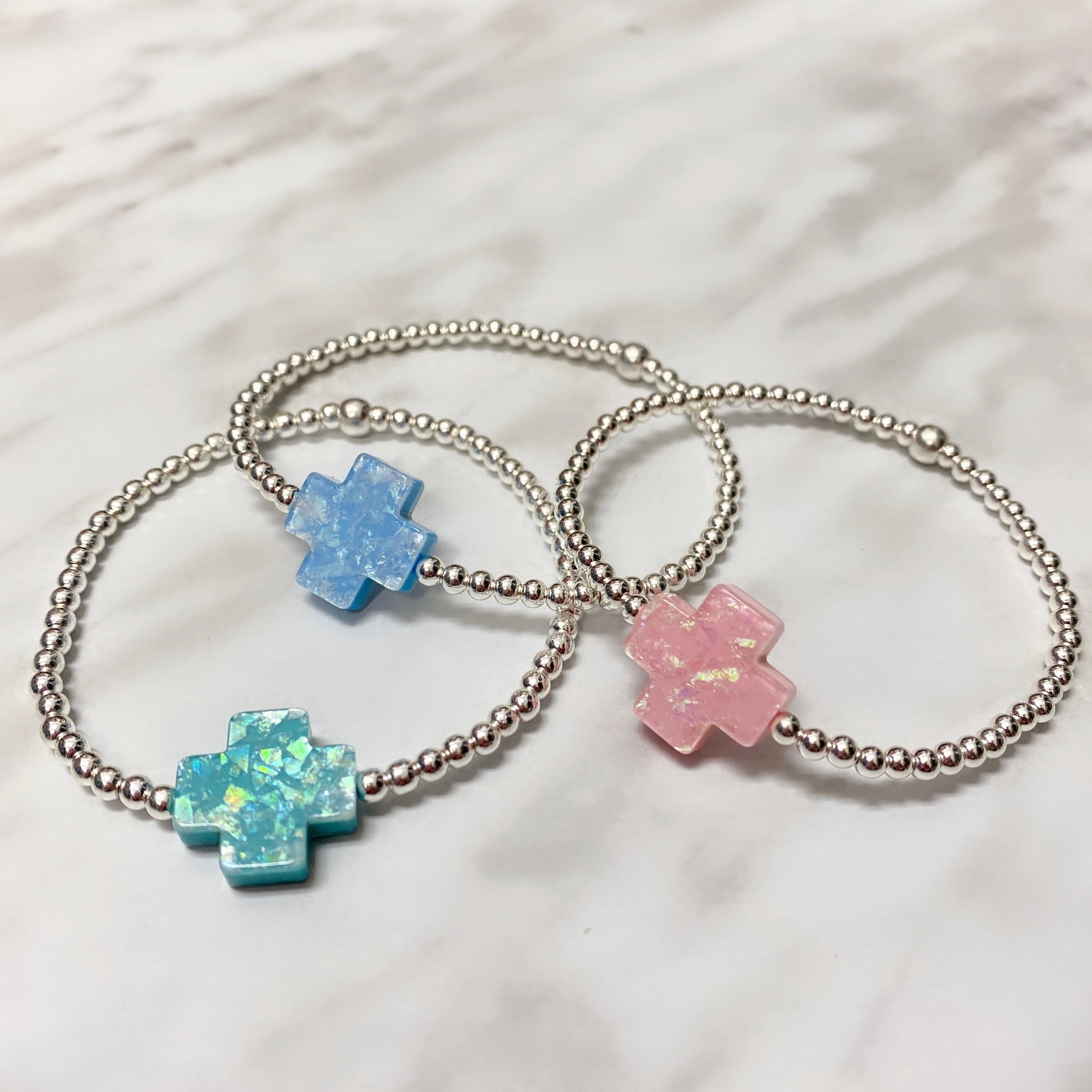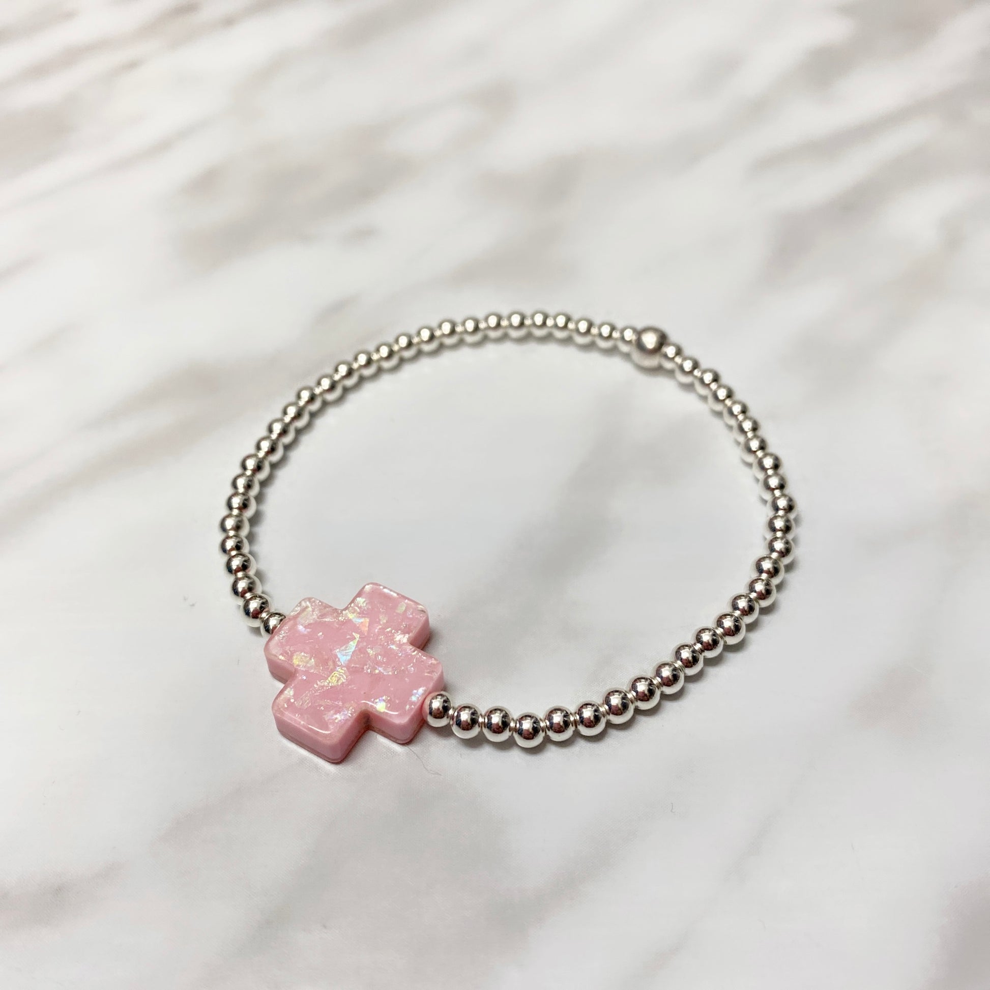 #3 Silver plated hematite beads 3mm with pink opalized cross centre (stretch)