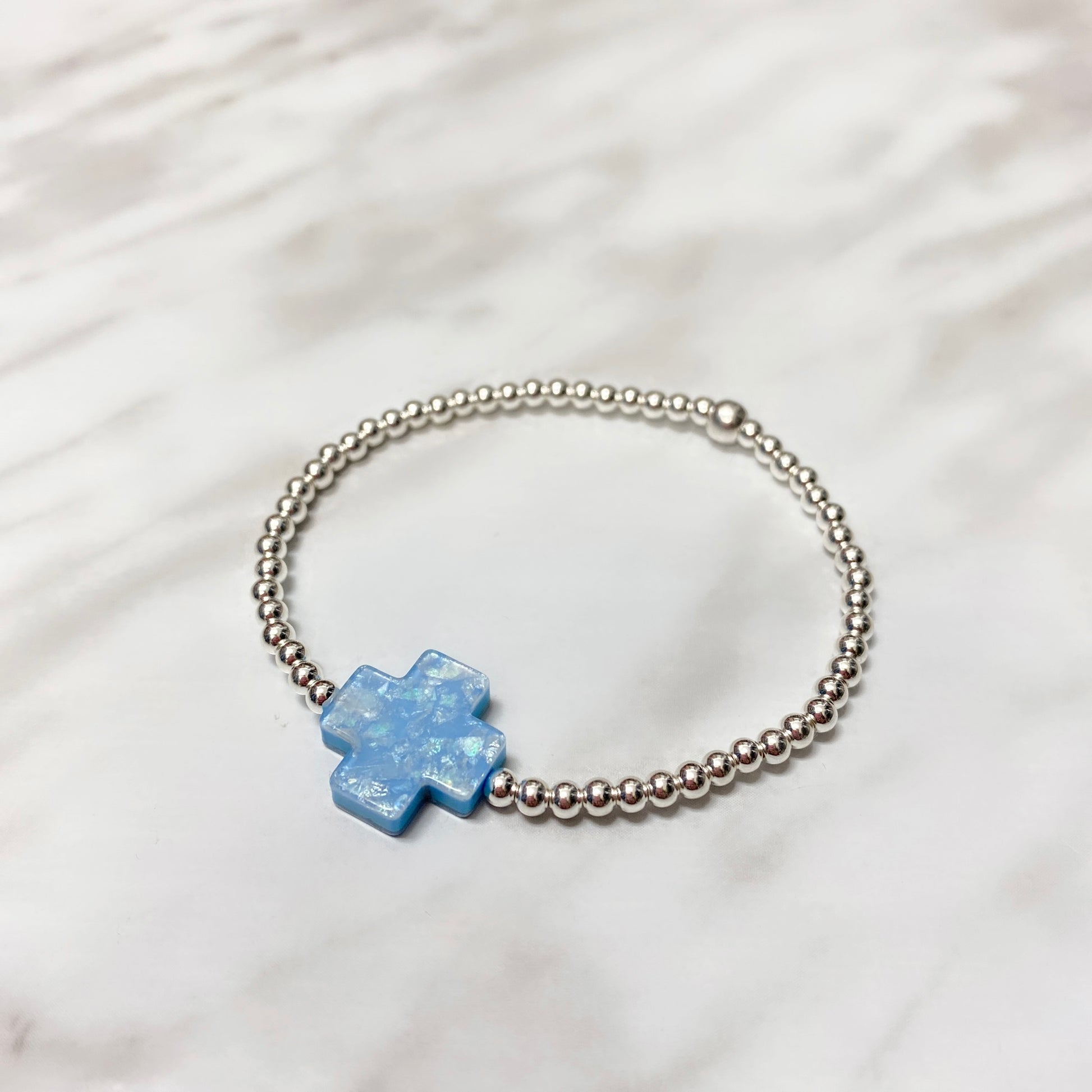 #2 Silver plated hematite beads 3mm with blue opalized cross centre (stretch)