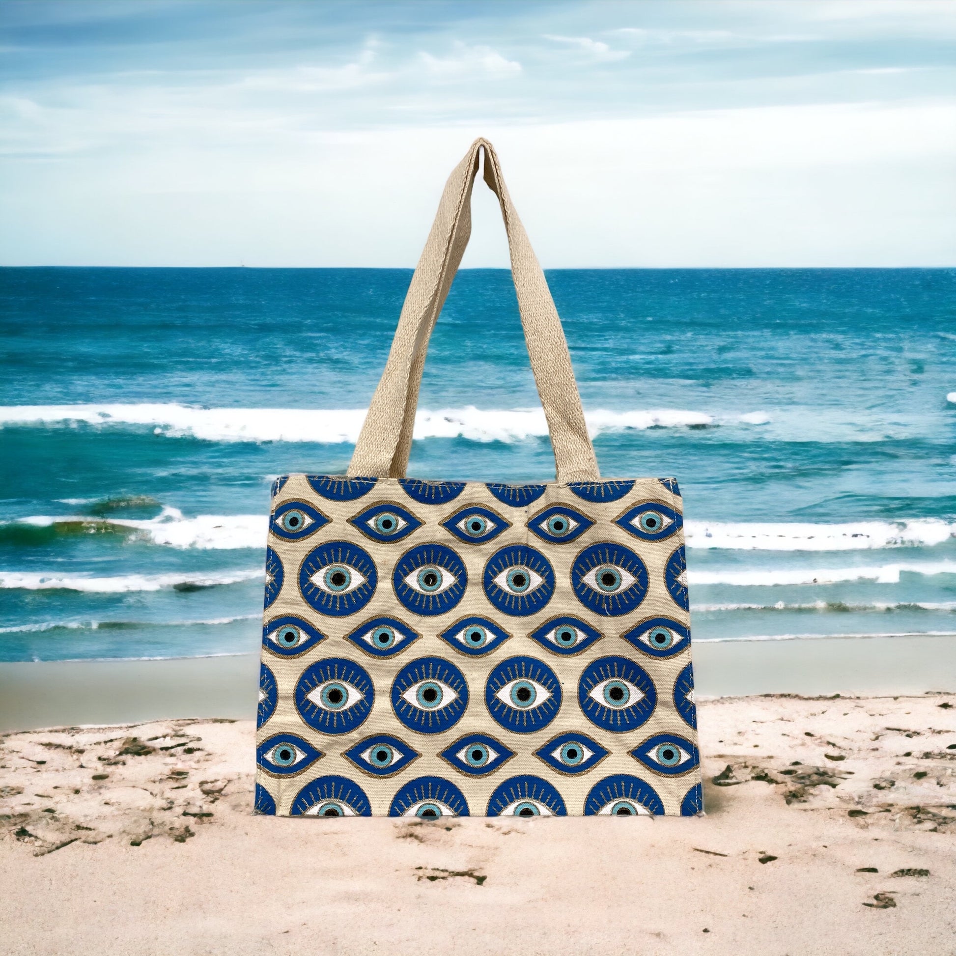 Beautiful cotton blend canvas tote bag with evil eye design.