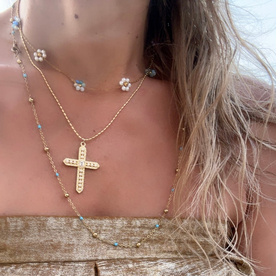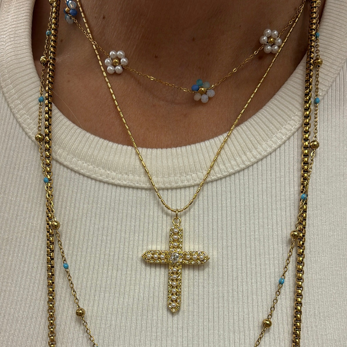Stunning delicate flower chain with pearl cross pendant and enamel long chain, beautiful enough to wear alone or layered.